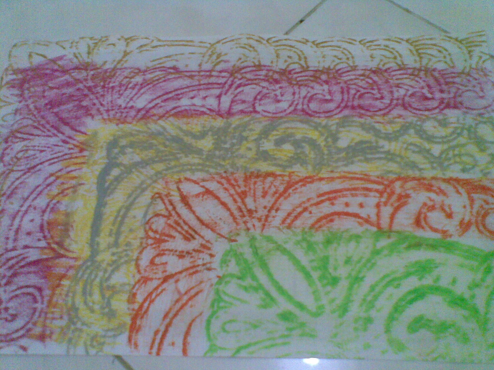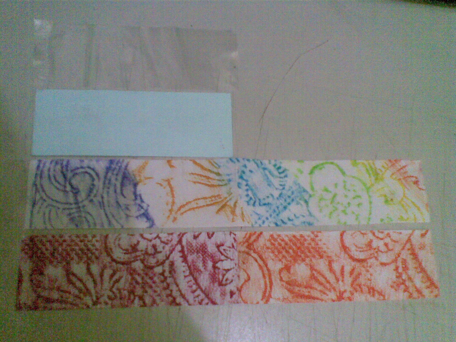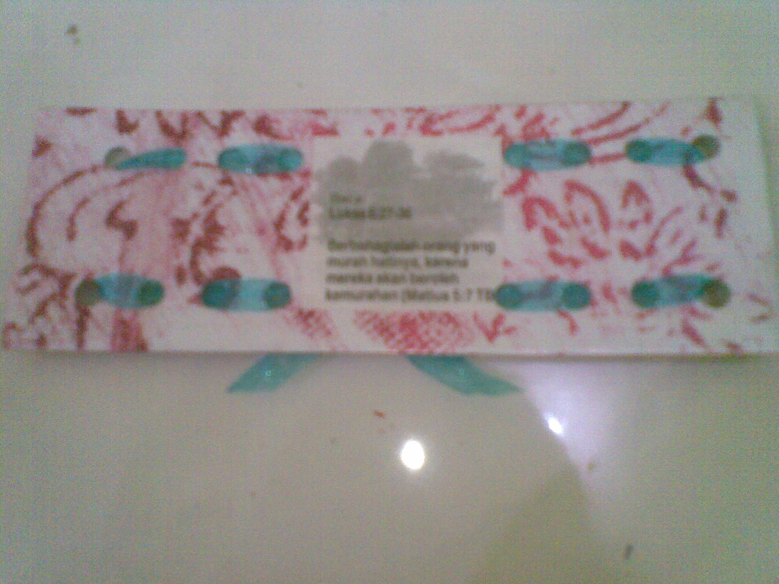 siapkan cutter, pita berbagai warna, gunting dan alat pelubang kertasuntuk pengganti laminating, siapkan plastik es lilinsiapkan penggaris dan pensilsiapkan karton telal bekas sampul buku, bekas tanggalan ataupun undangan.sediakan media untuk dijiplak, misalnya taplak timbul, kain bordir, dllgunting kata mutiara, dan ayat mas dari renungan harian yang sudah lewat tanggal, atau print sendiri.jiplaklah taplak timbul atau kain brokat di atas kertas bekas menggungakan goresan cryon (dalam contoh gambar ini, saya menggoresnya dari titik tengah ke berbagai penjuru), kertas hasil jiplakan ini saya namai kertas batik.potong kertas tebal seukuran plastik es lilin penuh (kurangi sekian mili agar tidak sempit saat dimasukkan), potong kertas 'batik' dalam dua kali ukuran plastik es lilin. Setelah itu lipat kertas 'batik' menjadi dua, sematkan kertas tebal di sela-sela lipatan. Cara ini memungkinkan kartu anda bolak balik dan lebih tebal.Kini anda telah siap memberi ayat dan kata-kata mutiara, masukkan dalam plastik es, beri lubang di tempat yang anda inginkan sesuai dengan design anda, dan sematkan pita untuk membuat plastik dan kertas tidak terlepas. Jadi deeeeech...!! Mudah Kan...?contoh kertas batik yang digores dengan multi warnaanda bisa membuat kertas batik ini menjadi kertas kado buatan sendiri, dan kegunaan lainnya.anda bisa juga menjadikan kertas batik ini sebagai hiasan kaleng tempat pensil.ambil pinggirannya saja dari taplak timbul atau kain brokart, geser kertas untuk mendapatkan motif bertumpuk ini.lipat kertas menjadi empat bagian simetris, jiplak dari tempat yang sama untuk mendapatkan pengulangan pola kembar.bisa juga diberi gambar bentuk hati atau lainnya sesuka hati anda...kalau kertas batik yang ini, dibuat dengan cara menggores jiplakan taplak timbul menggunakan cryon putih, setelah itu disaput merata dengan cat air. Sifat cryon yang berminyak tidak akan menyatu/mencampur dengan sifat air dari cat air tersebut.banyak kaleng biskuit bekas di rumah anda....ow ow....jangan dibuang...bisa untuk kado anak sekolah minggu anda...yooook kita percantik kaleng ini...!!.lilitkan kertas batik ini pada kaleng, sambung kedua ujungnya dengan selotip, lipat ke dalam tabung sisa kertas, bubuhkan hiasan pita sesuka anda.duh duh duh...cantiknya.....anak-anak pun bisa ikut membuat prakarya mudah ini.berguna untuk tempat alat tulis..."BERIKAN KARYA TERBAIK BUAT TUHAN KITA....AMIN !!"