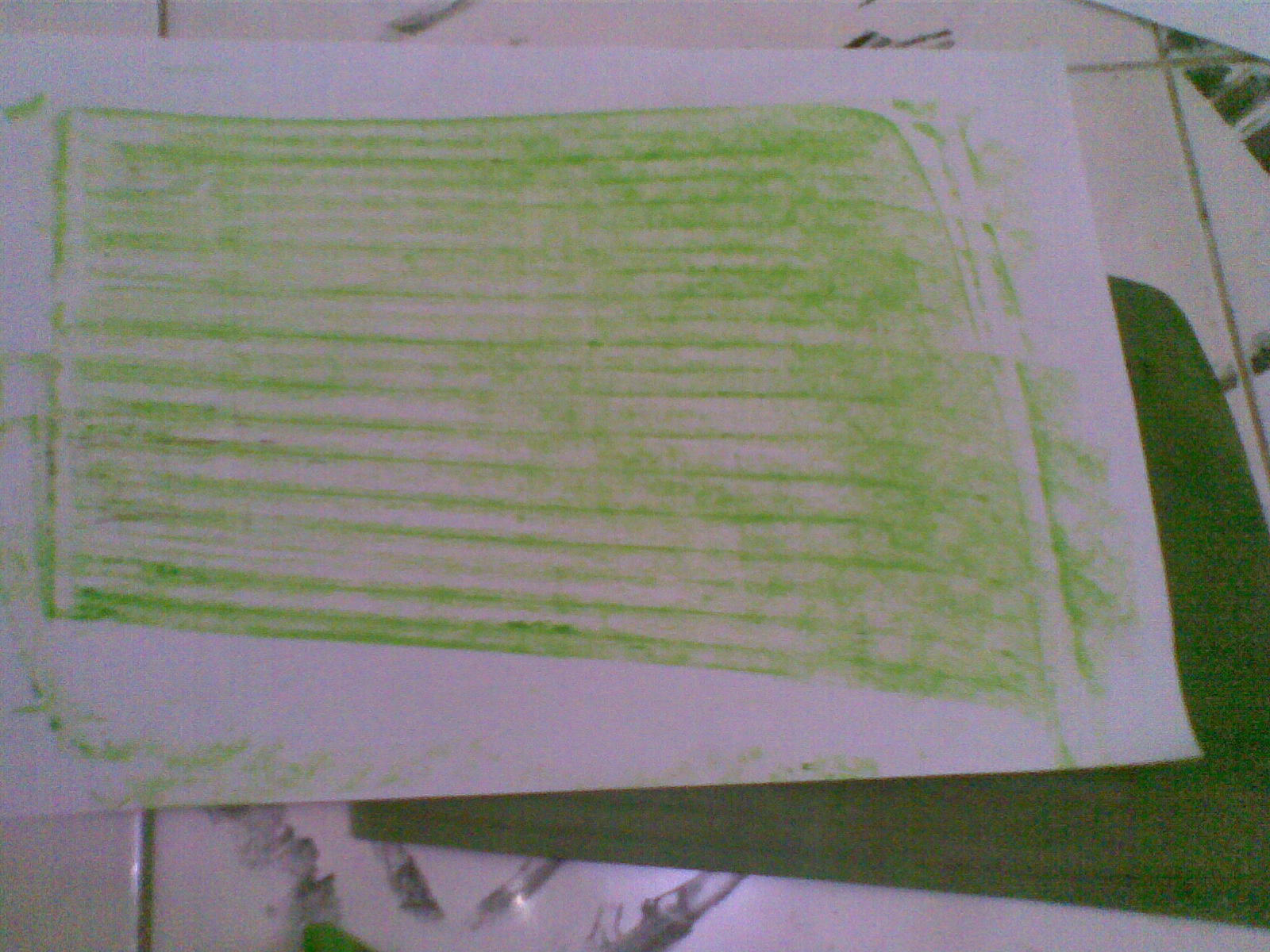 Anda juga bisa memakai daun yang ukurannya melebihi ukuran kertas, sehingga seluruh kertas mendapat goresan garis daun pisang. Ingat…cara menggoreskannya dengan menidurkan cryon, dengan arah arsiran SEARAH dengan arah garis daun pisang.