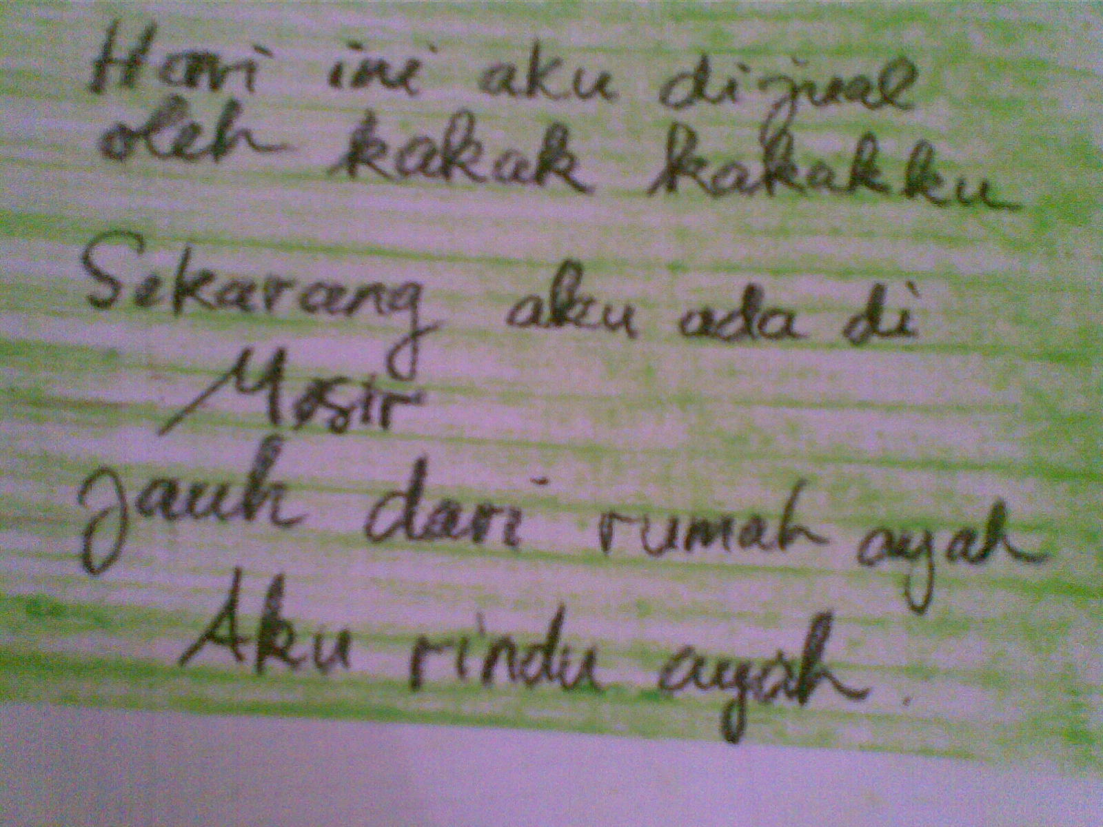 Ayah…Aku sangat merindukan dirimu, bahkan aku tidak tahu dimana engkau berada. Aku selalu bertanya ; Apakah Ia selamat? Apakah Ia masih hidup? Tidak ada yang bisa menjawab karna mereka pun juga tak tahu