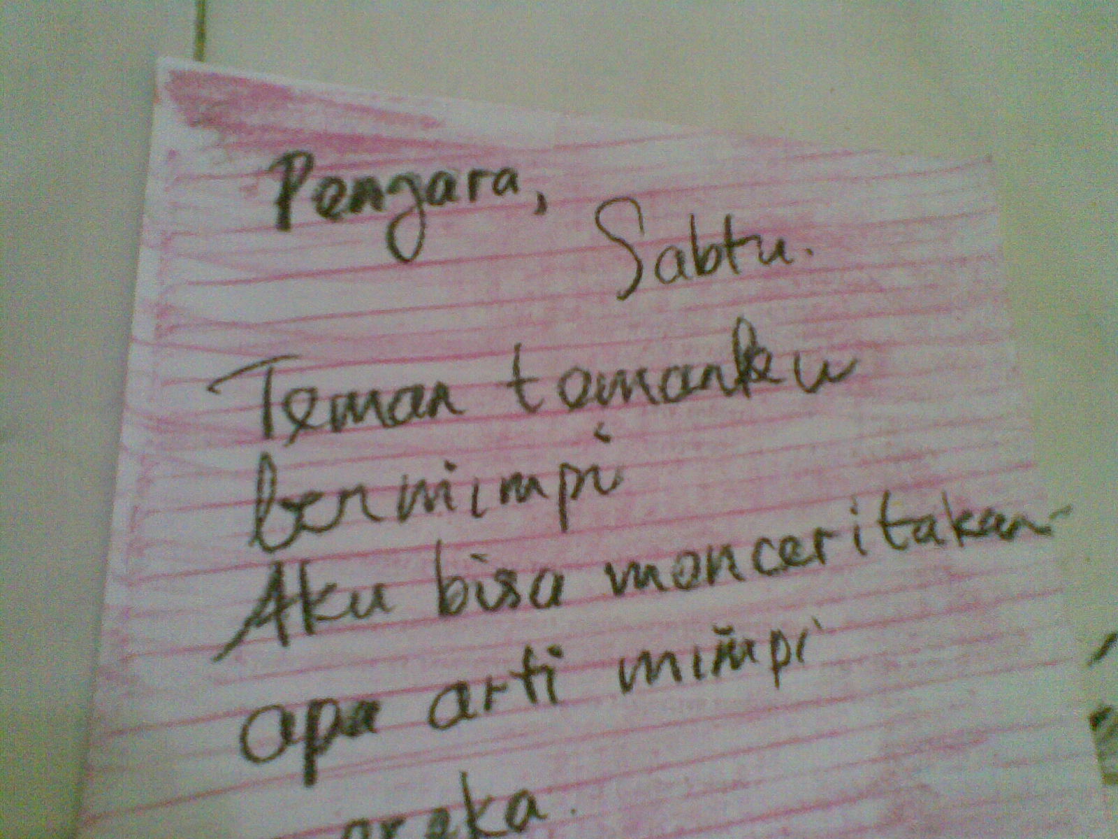Runcingkan cryon berwarna hitam mengunakan alat peruncing cryon yang ada di kotak cryon, tuliskan catatan pribadi Yusuf mengikuti garis jiplakan daun pisang tadi. "Penjara, Sabtu, Teman-temanku bermimpi, Aku bisa menceritakan apa arti mimpi mereka. Benar saja, 3 hari kemudian mereka keluar dari sini , semoga temanku itu ingat penderitaanku di sini.