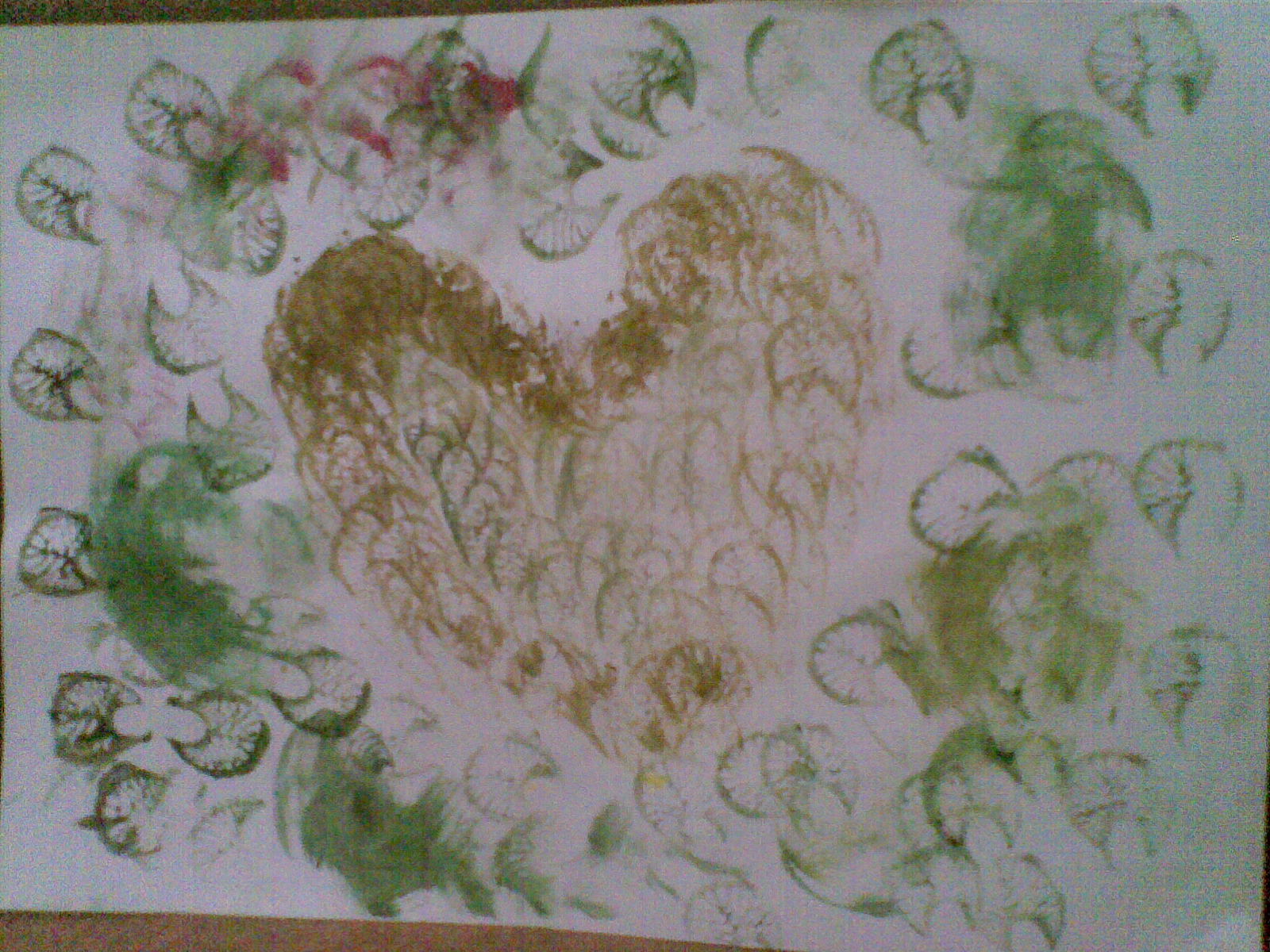 Untuk memudahkan siswa, guru membuat dahulu pola gambar hati di sebuah kertas, tetapi bentuk hati tersebut jangan diwarnai, biarkan dipenuhi oleh anak-anak dengan cap yang terbuat dari TULANG DAUN PISANG