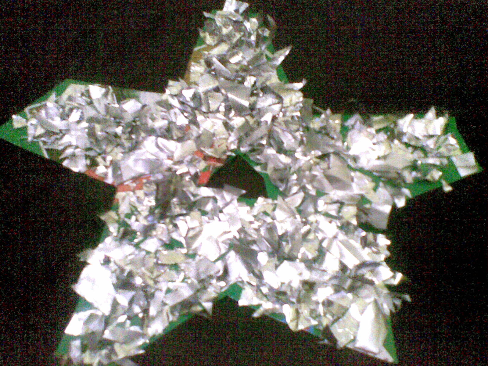 Ambil kemasan susu bekas, atau bisa juga aluminium foil, atau bahkan kemasan makanan anak-anak yang baliknya berwarna perak bercahaya, potong dalam ukuran kecil-kecil, tempelkan pada esolasi bolak-balik yang sudah digunting sama panjang dan ditempel berbentuk bintang.