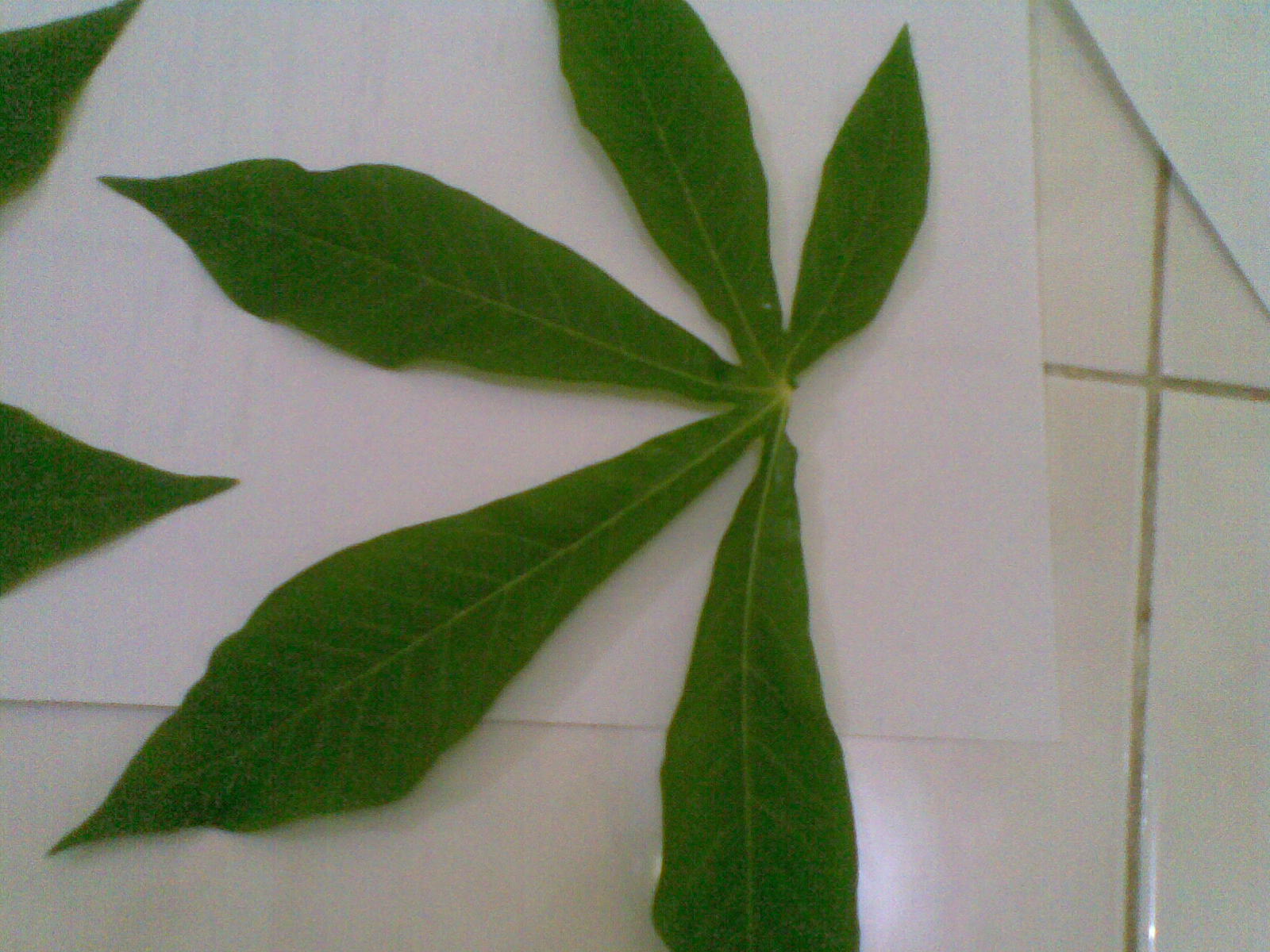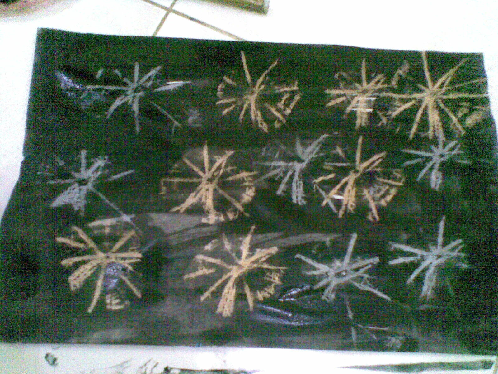 Pilih daun ketela dua lembar, rekatkan kanan dan kiri, balik kedua daun tersebut untuk mendapatkan tulang daun yang lebih jelas di bagian belakang, gores hanya bagian tengah saja menggunakan cryon berwarna emas atau perak saja, karna hanya dua warna ini yang dapat bercahaya di tengah kegelapan, timpa dengan cat air berwarna hitam untuk memberi kesan langit berwarna gelap di malam hari.