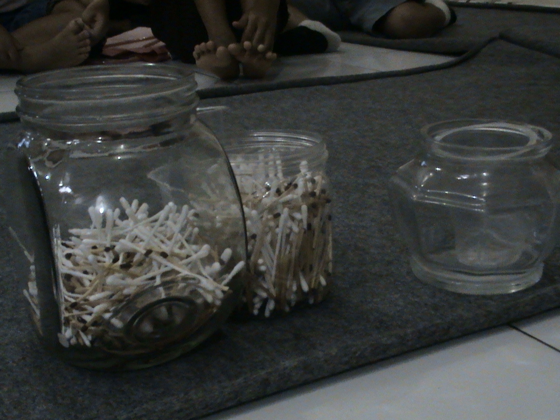 Guru menyiapkan cotton buds dalam jumlah banyak. Guru menyiapkan korek api dalam jumlah banyak. Kedua jenis benda ini dicampur menjadi satu. Sediakan dia wadah, dimana anak-anak memisahkan antara cotton buds dengan korek api ke dalam dua wadah yang berbeda. Kelompok yang paling cepat selesai adalah kelompok pemenang.