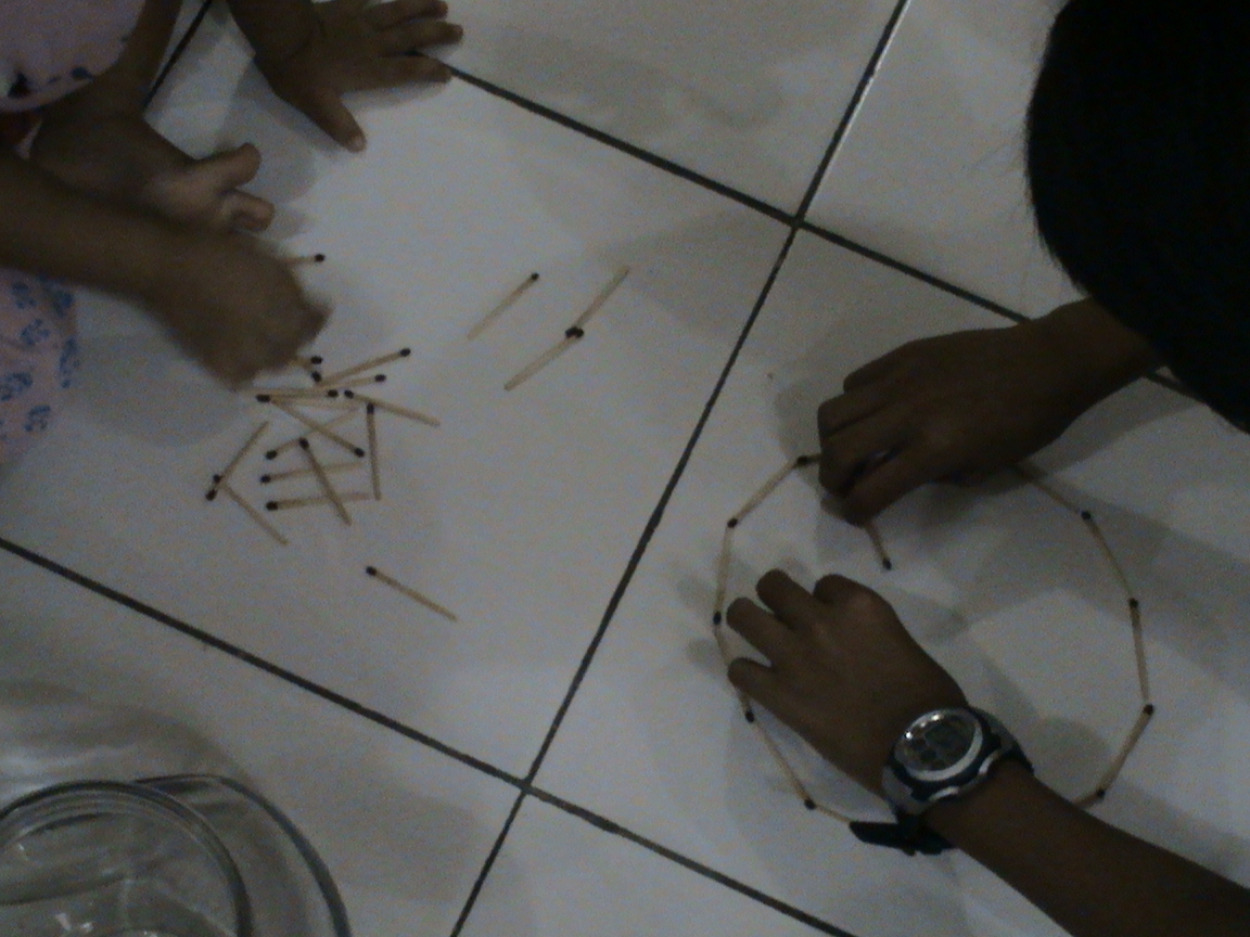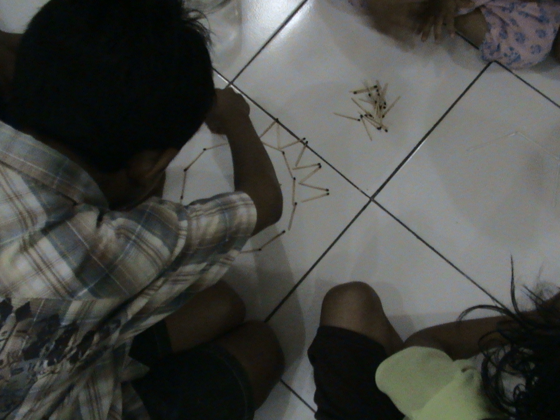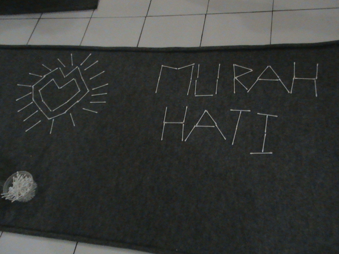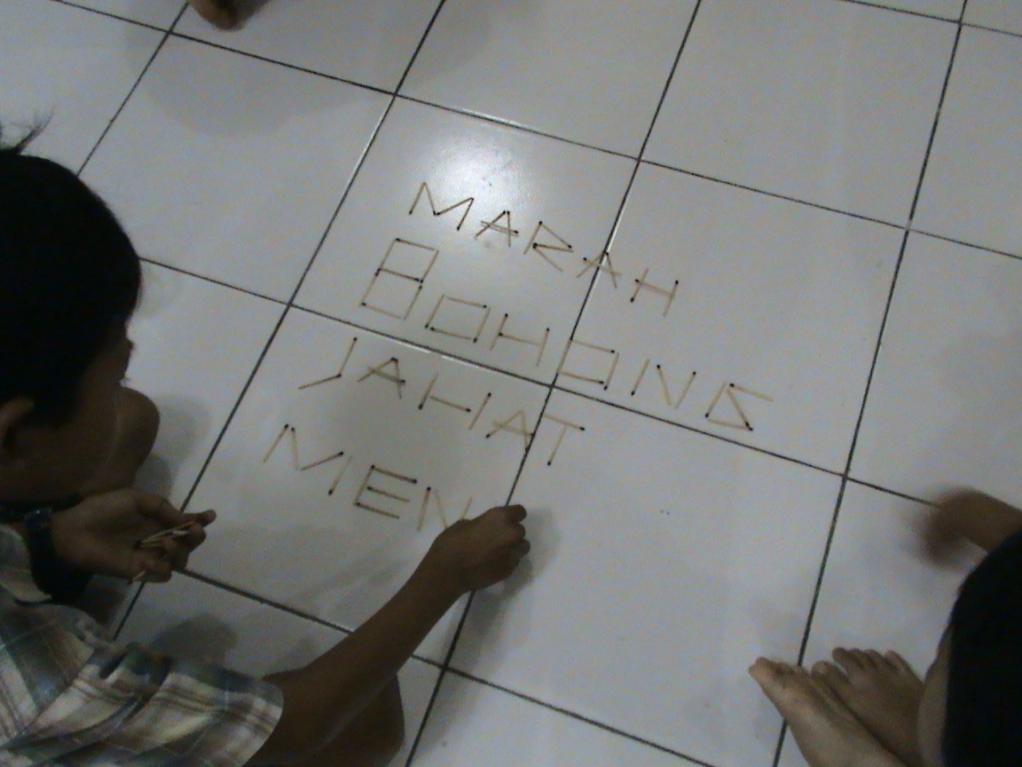 Bagi anak-anak menjadi dua kelompok, yaitu kelompok ‘A’ dan kelompok ‘B’. Kelompok ‘A’ bertugas menyusun cotton buds yang ada menjadi huruf-huruf bertuliskan KASIH, SUKACITA, dst, sedangkan kelompok ‘B’ menyusun korek api menjadi bertuliskan : PERCABULAN, KECEMARAN , dst.