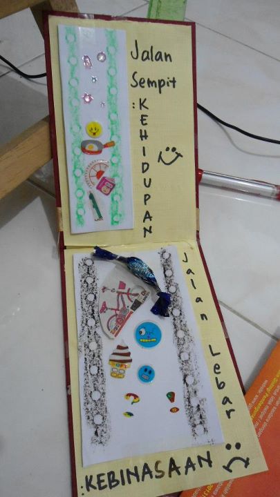 • Guru menceritakan contoh kasus, setelah guru bercerita, minta anak-anak memegang contoh tadi, berarti si tokoh dalam cerita itu ikut jalan sempit atau jalan lebar ya..?