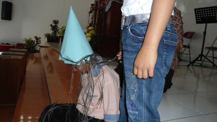 NB : bisa menambahkan nama-nama dosa Simson di sebuah kertas, yang dibaliknya sudah diberi perekat esolasi bolak-balik, untuk direkatkan di tiap ikatan tali, sesuai isi cerita. Bisa tambahkan tanda salib pada gunting, dan menjelaskan pada anak-anak bahwa kuasa salib Kristus, menolong kita bebas dari ikatan dosa. (Ini adalah pengembangan ide dari Guru Sekolah Minggu GPDI Bayeman, Kak Jun Mei, terima kasih pada Kak Jun Mei)