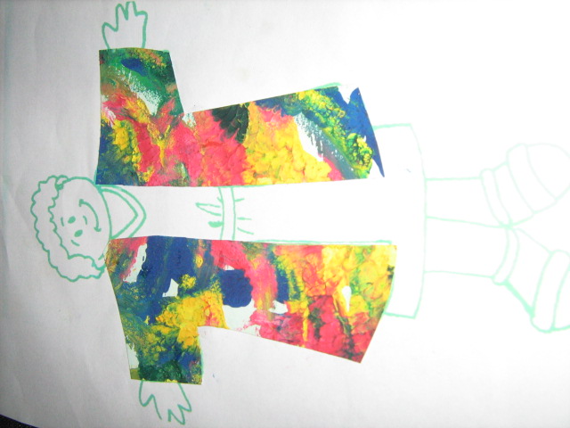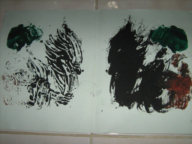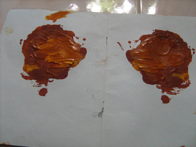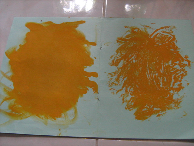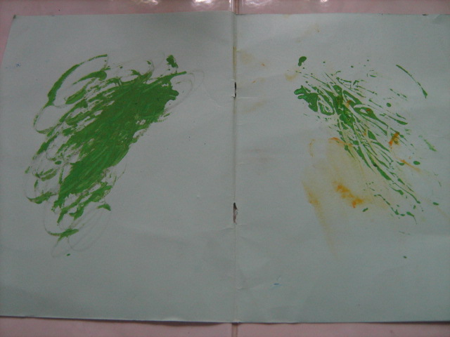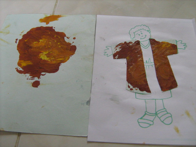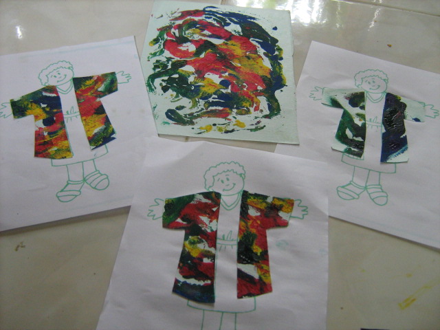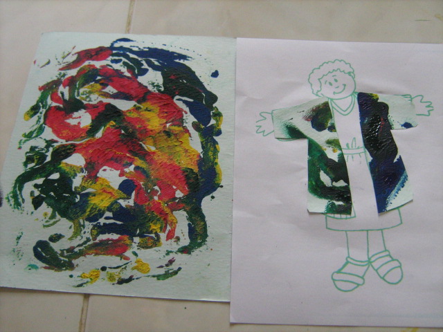i. Minggu I, setelah materi lain, sebelum pulang, kelas BATITA dan BALITA , kita ajak membuat seolah-olah nantinya akan menjadi kain pembuat jubah Yusuf,( tapi tetap terbuat dari kertas, kata ‘kain’di sini hanya untuk mengembangkan imajinasi anak saja, bahwa nantinya lukisan lipat ini akan menjadi bahan pembuatan Jubah Yusuf), yaitu KAIN LUKIS ABSTRAK, yang terbuat dari lukisan lipat (lihat foto-foto terkait). Jemur hasil lukisan anak. Pisahkan antara Lukisan Awal, dengan Hasil Lipatan (Keterangan: lukisan awal nanti akan dijadikan Jubah Yusuf, sementara itu Hasil Lipatan, akan disimpan, dengan nama pelukisnya, sehingga nanti akan diletakkan berdekatan dengan hasil Jubah yang sudah jadi) Lukisa Awal disimpan untuk minggu depan. Beri nama pelukis pada tiap hasil lukisan (dibaliknya), pilih area yang nantinya tidak mungkin digunting.