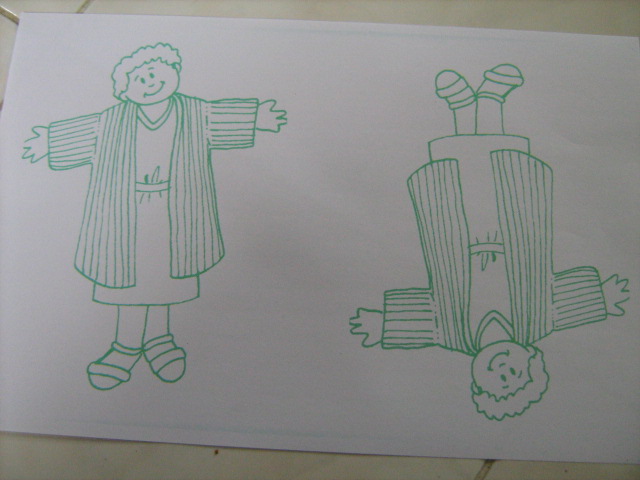 ii. Minggu II, setelah mendengar cerita materi lain, sebelum pulang, hasil lukisan lipat dari kelas batita dan balita minggu lalu, kini sampai di kelas ANAK 1-2 (Kls 1-2 SD). Tugas anak mereka adalah menjiplak pola jubah Yusuf dari gambar asli ke kertas tipis. Buatlah pola sejumlah lukisan yang ada. Jangan lupa untuk memberi nama pembuat pola pada tiap lukisan. Pola ini jangan digunting dulu, biarkan saja pada lembaran kertas.