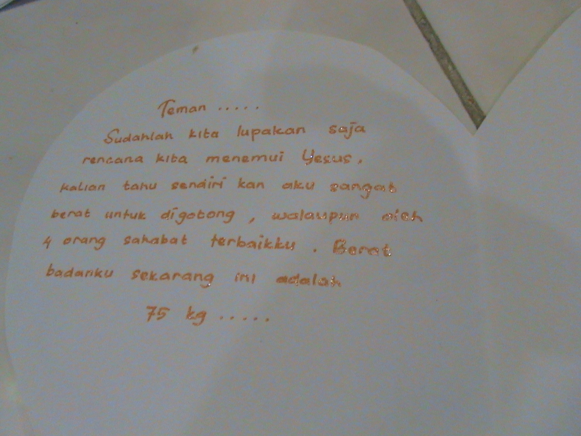 Teman…..sudahlah kita lupakan saja rencana kita menemui Yesus, kalian tahu sendiri kan aku sangat berat untuk digotong, walaupun oleh 4 orang sahabat terbaikku. Berat badanku sekarang ini adalah 75 Kg….