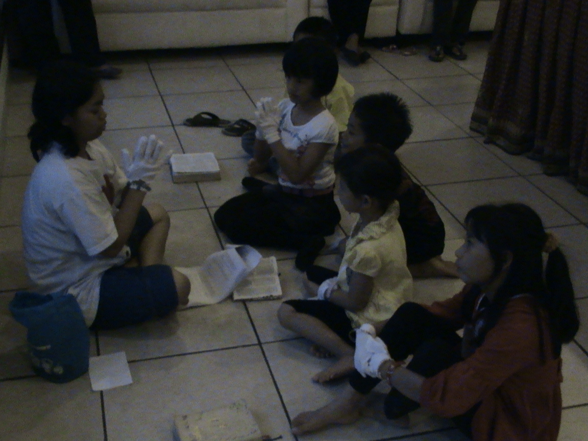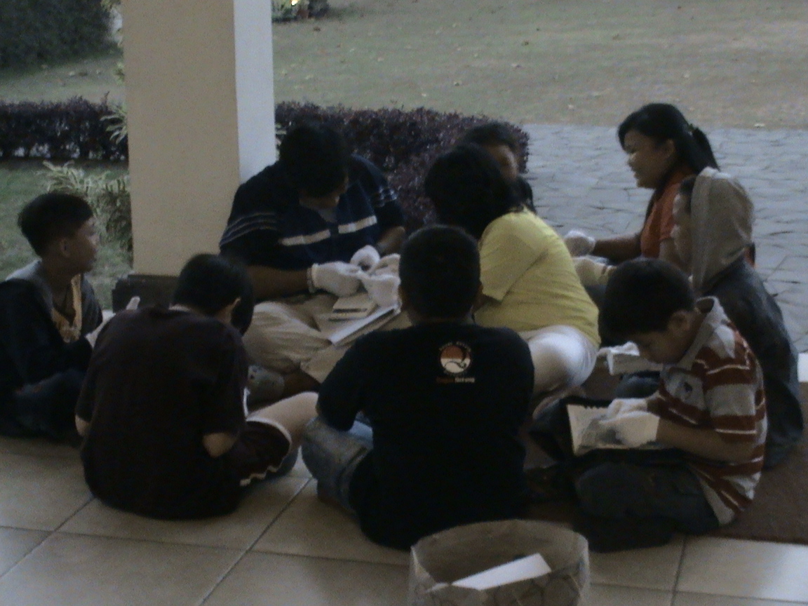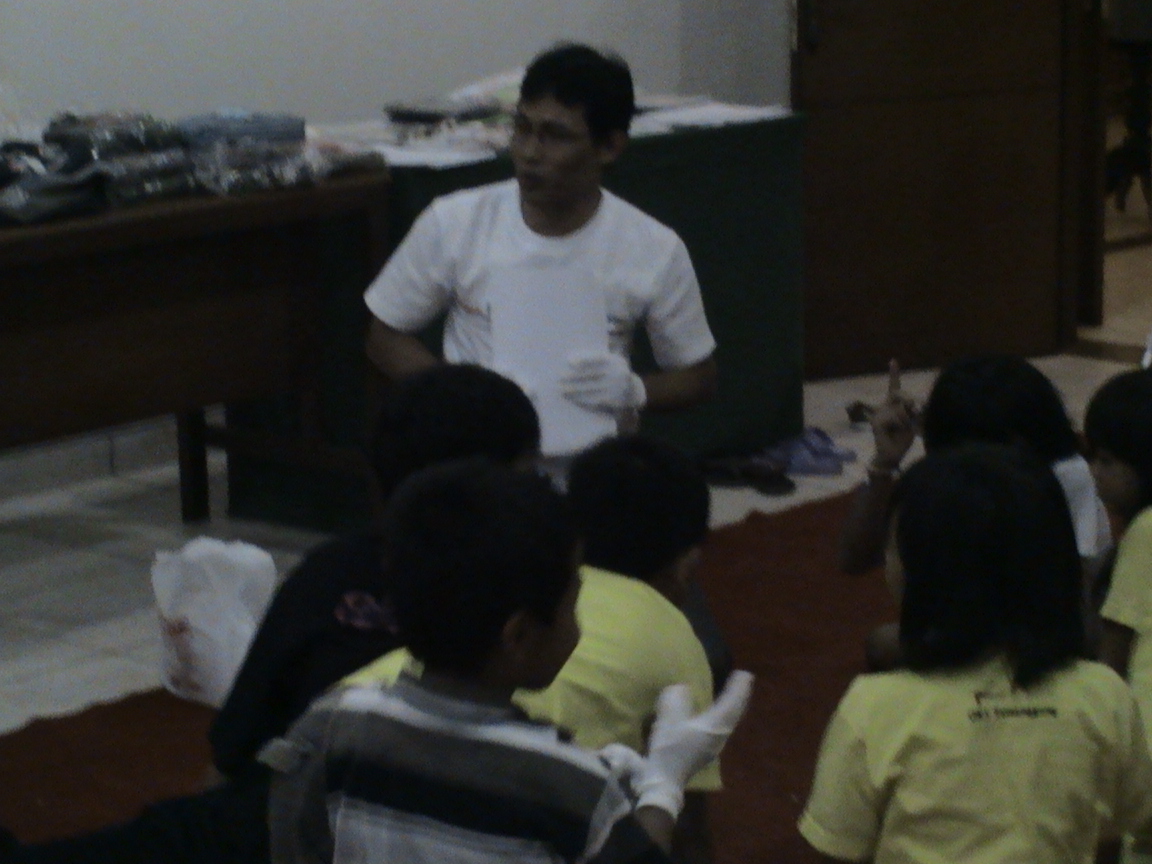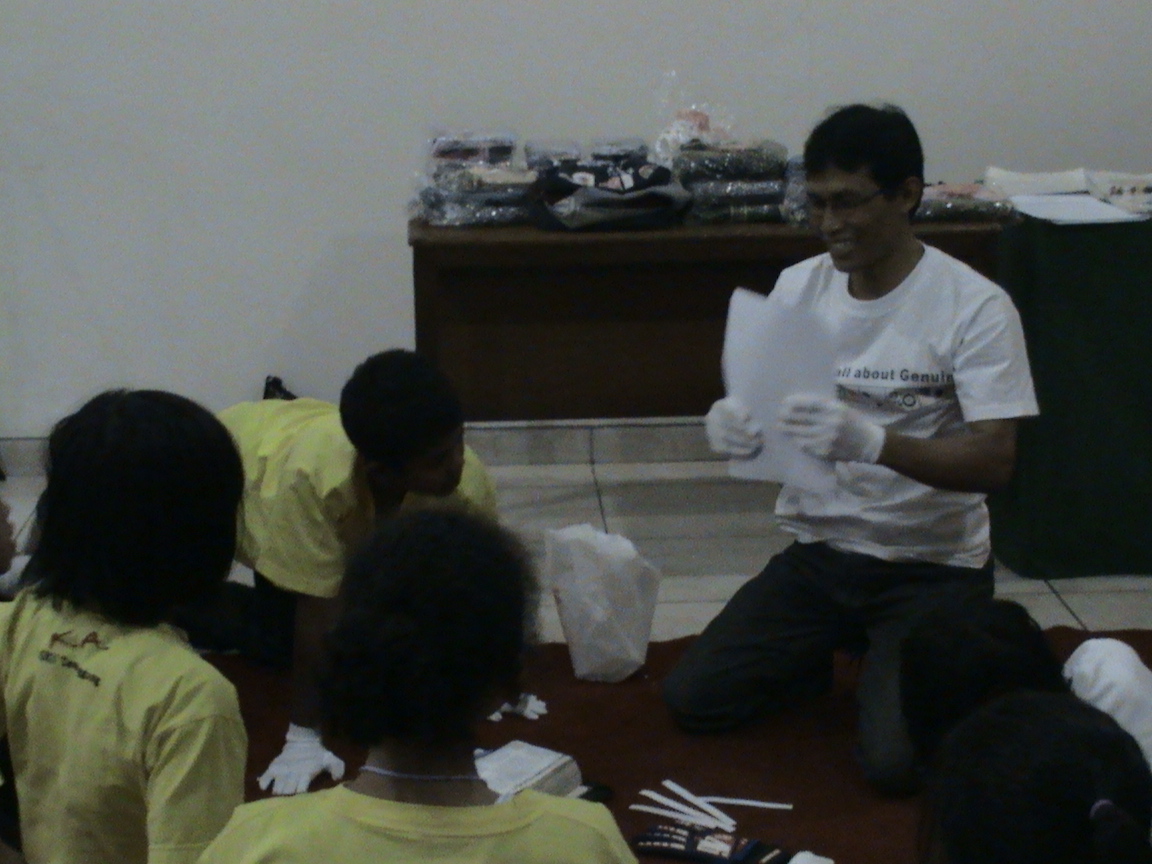 Diantara jari jemari kakak, (kakak memakai kaos tangan) kakak menyelipkan surat dari sahabatmu yang lumpuh itu, yang kalian kasihi, tolong tuliskanlah balasannya di sebelah kanan kartu surat itu. Dalam balasanmu harus ada kata KASIH