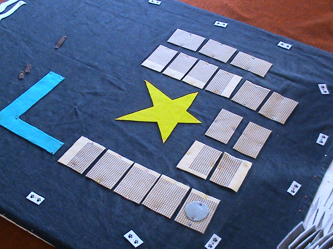 - KAIN FLANEL sesuai tempat-tempat yang anda butuhkan, misalnya warna kuning untuk istana raja, potong bentuk bintang, warna coklat untuk perumahan penduduk , potong bentuk persegi, dll) Saya juga menyarankan anda membeli kain flanel yang sudah mengandung gambar/ motif untuk memudahkan anda memainkan motif, warna, dan imajinasi anak. Kalau anda perhatikan di sini, saya pun memakai motif jejak kaki anjing untuk memberi tanda letak-letak perkemahan musuh.