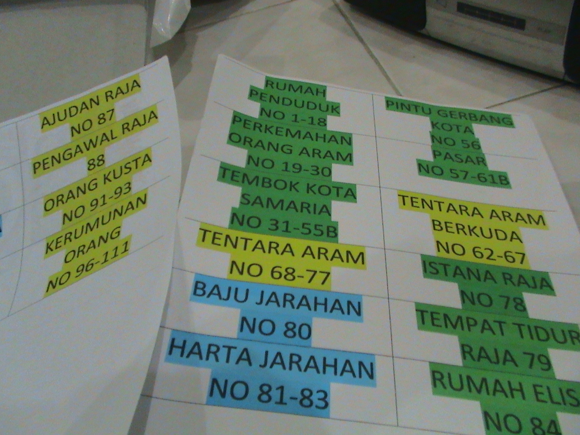- LABEL HARGA UNTUK STIKER PENOMORAN GAMBAR LIDI TANCAP. Anda membutuhkan label harga, untuk menuliskan angka dibalik dari setiap gambar lidi tancap. Tehnik metode Angka ini akan memudahkan anda mencari gambar apa yang nanti akan anda ambil untuk diberikan pada anak-anak untuk ditancapkan pada board sesuai alur cerita. Misalnya tembok kota Samaria, anda beri nomor 1-20 ( jika anda memakai 20 gambar lidi tancap), Raja diberi nomor 21, Elisa diberi nomor 22, dst. Untuk memudahkan, anda perlu waktu ekstra sebelum acara mulai, untuk menancapkan sesuai dengan urutan angka pada tepi board.