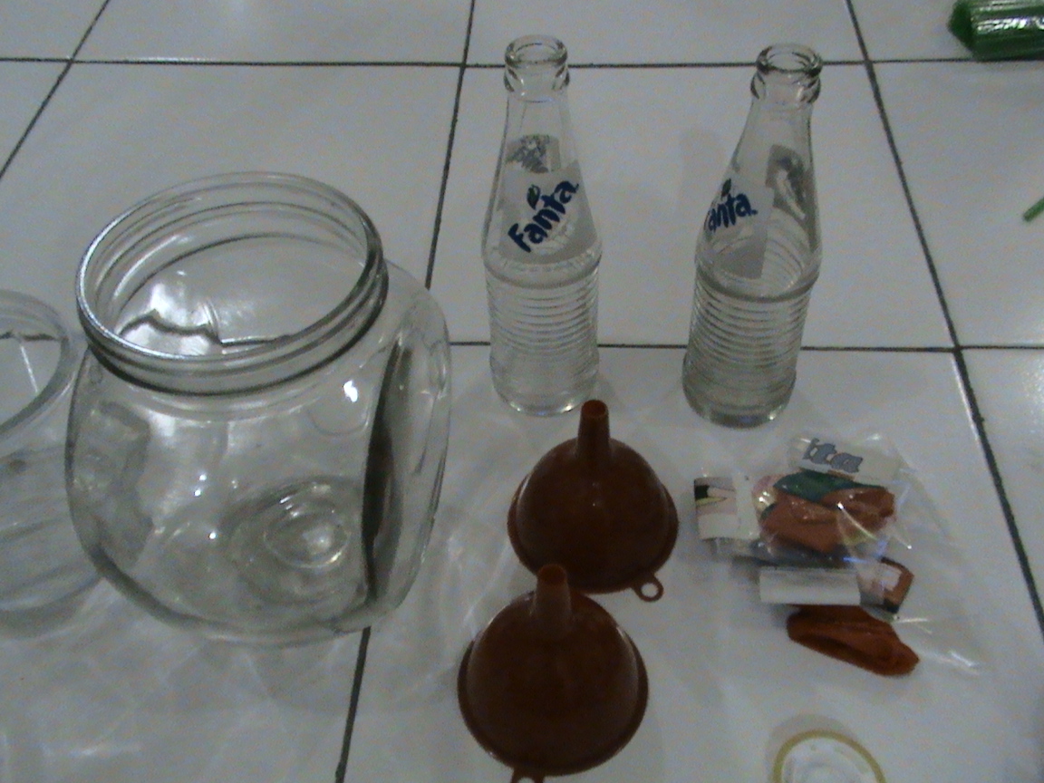 Menuang air dengan corong biasa, dan corong yang dibalut plastisin/ lilin.