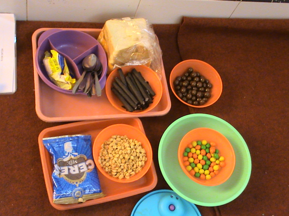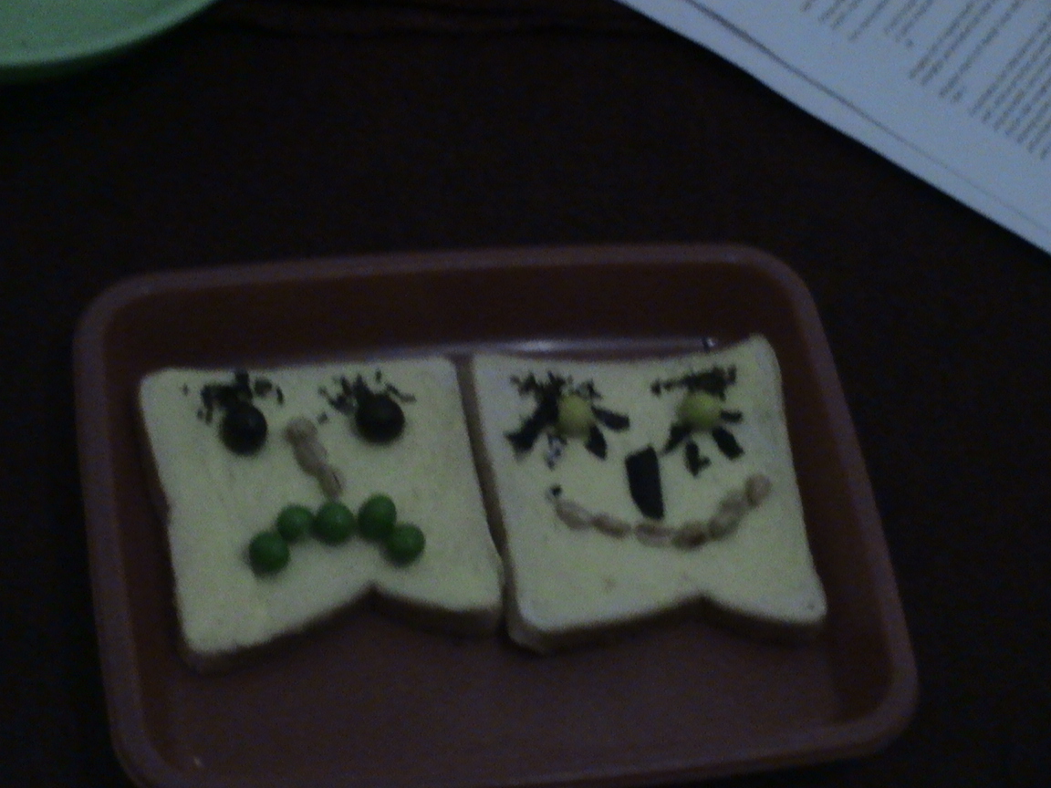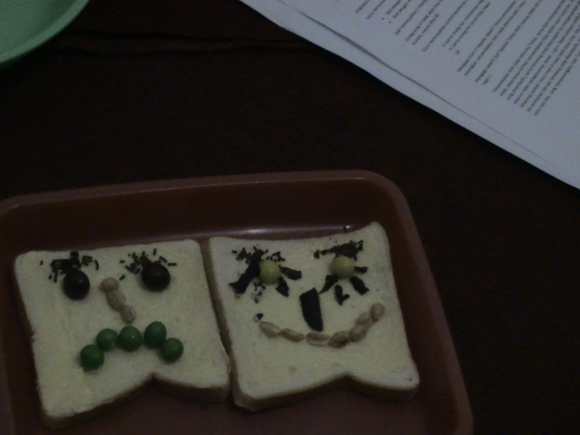 Guru membuat di depan anak anak, sambil terus bercerita, 2 keping roti yang telah dilukis dengan berbeda:,