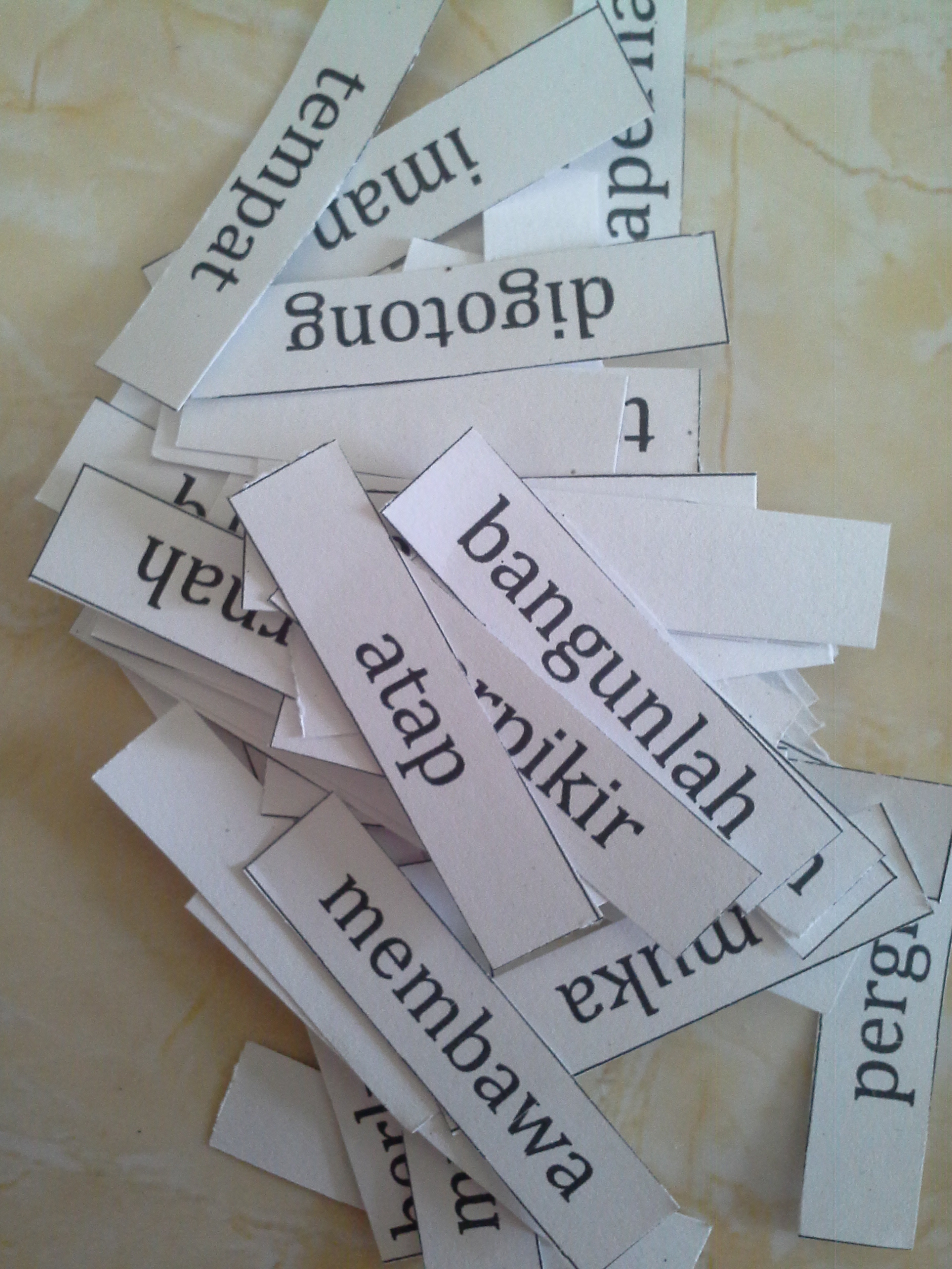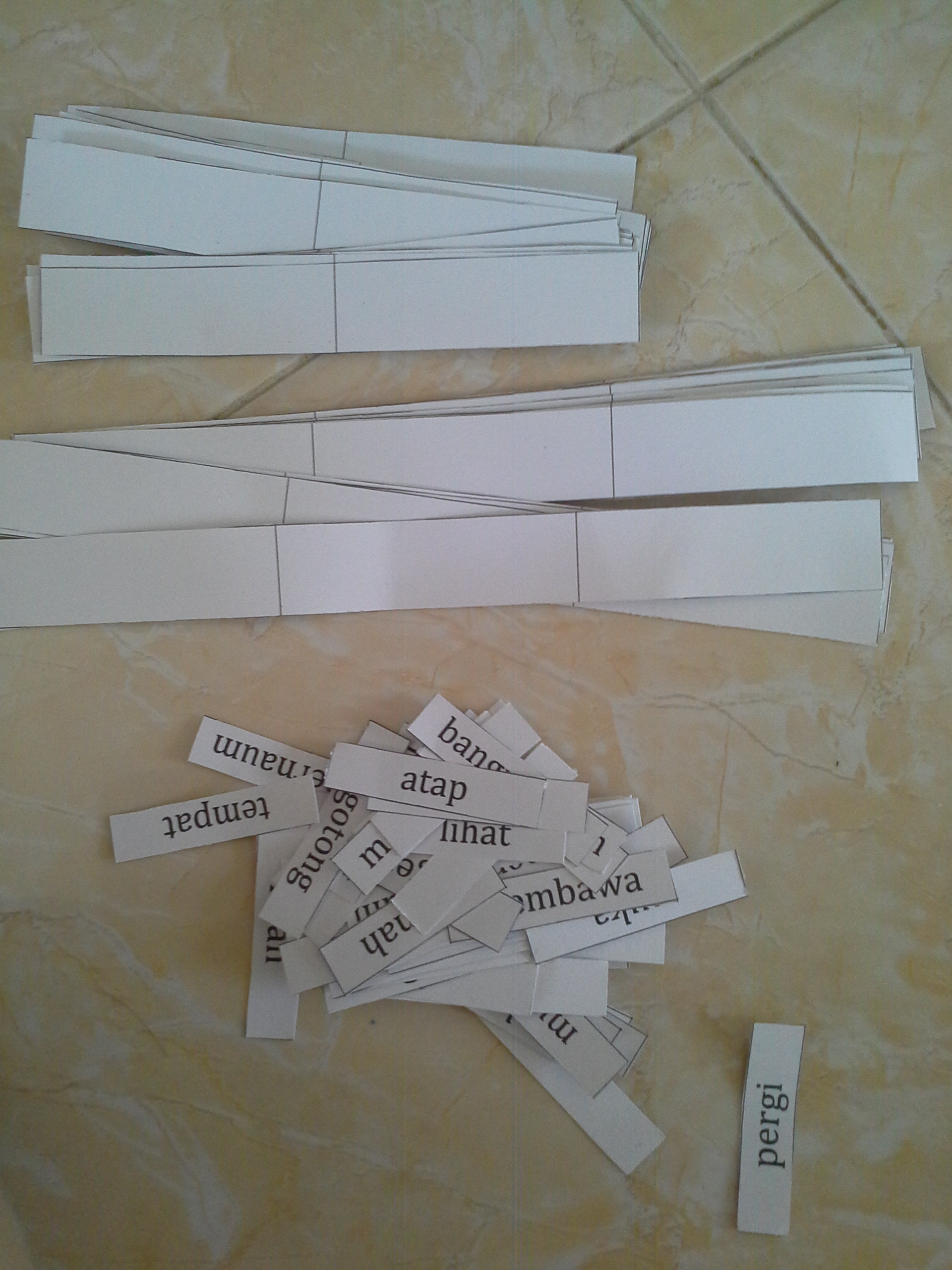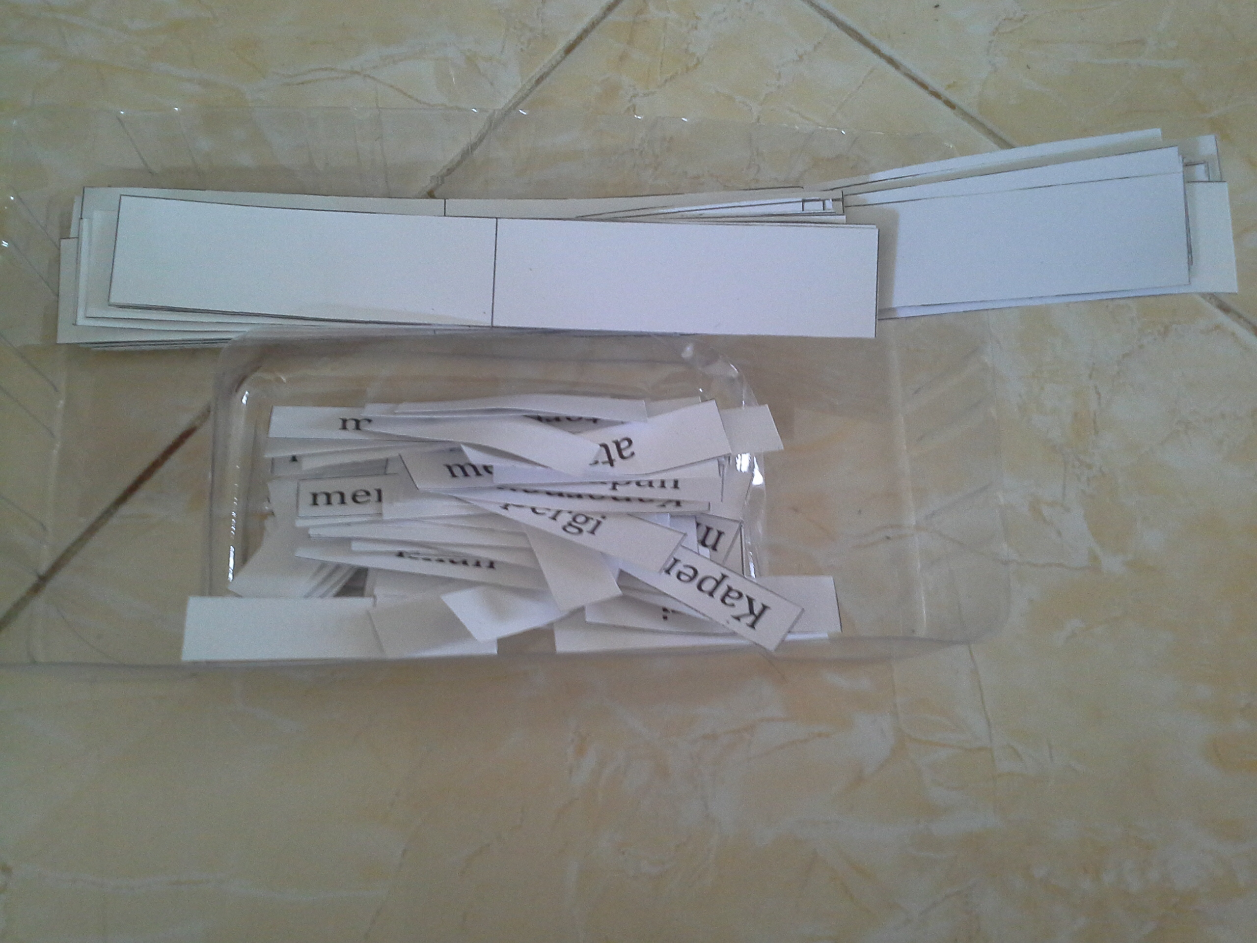Kartu sebelum dibagiakan sudah diacak, sehingga tiap anak mendapatkan tulisan kata yang tidak pada ayat yang sama
