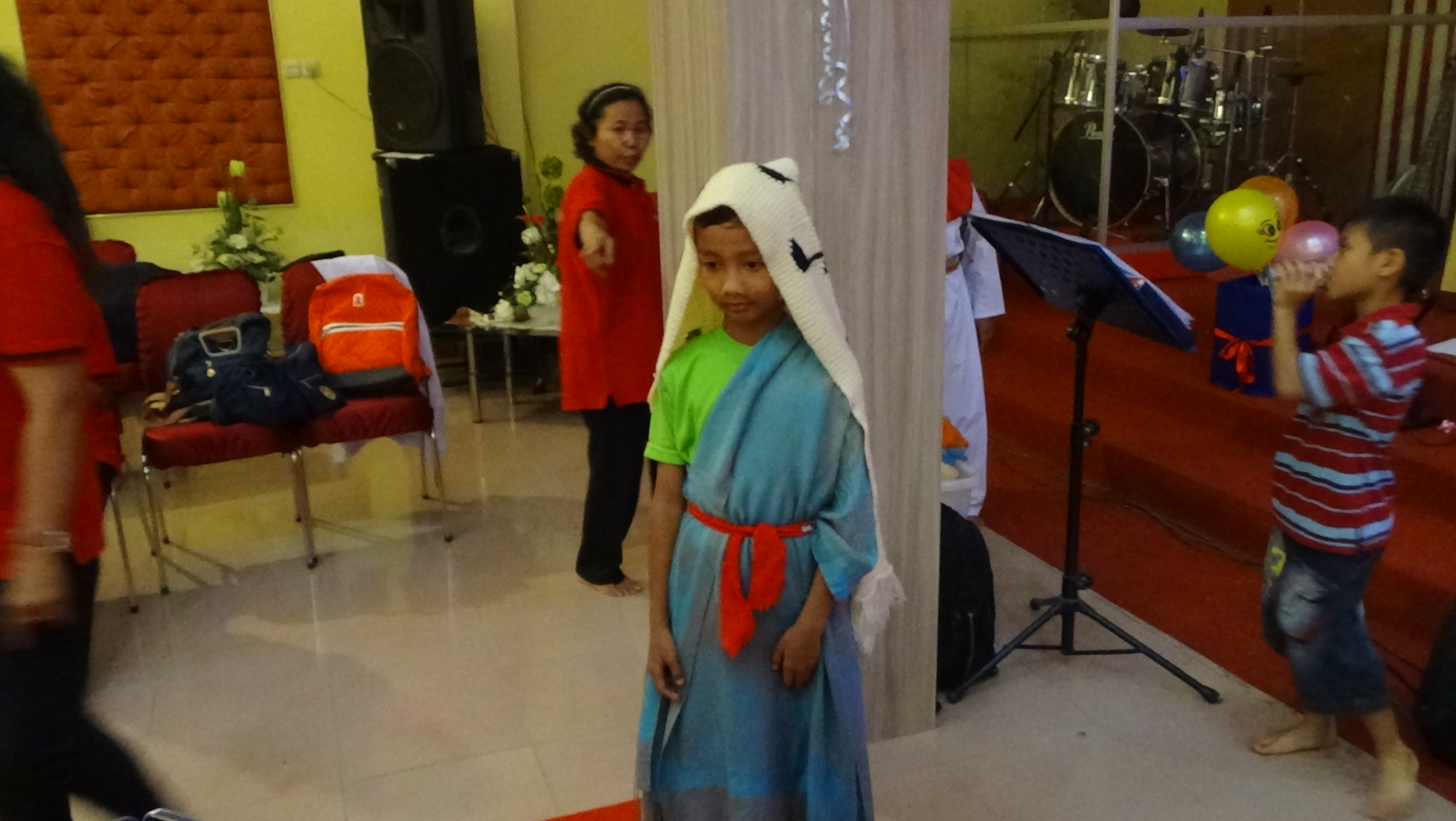 Sedangkan kostume tidak perlu dipakai oleh guru saat mencontohkan gaya berjalan Maria Magdalena. ( untuk menghemat waktu)