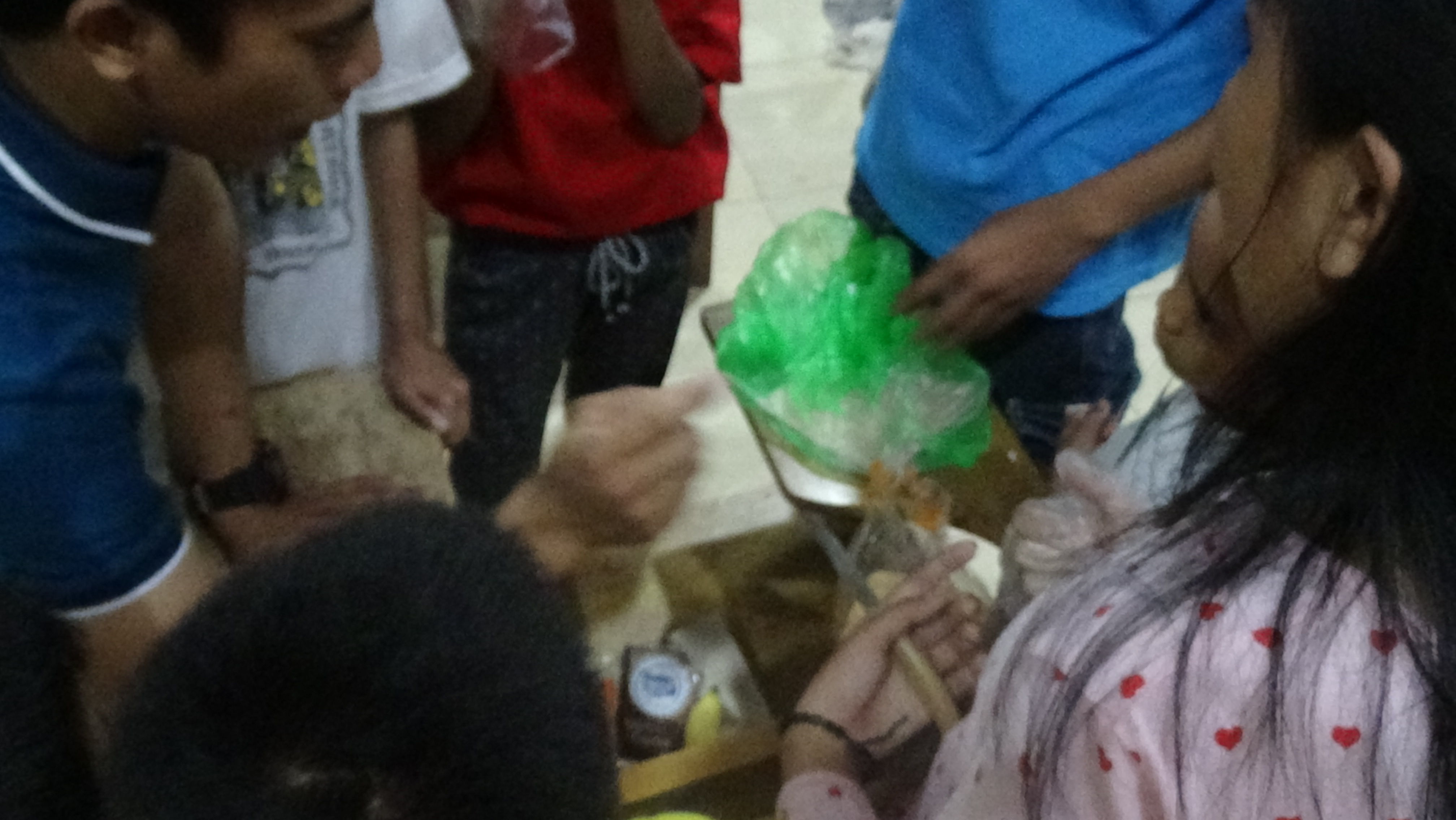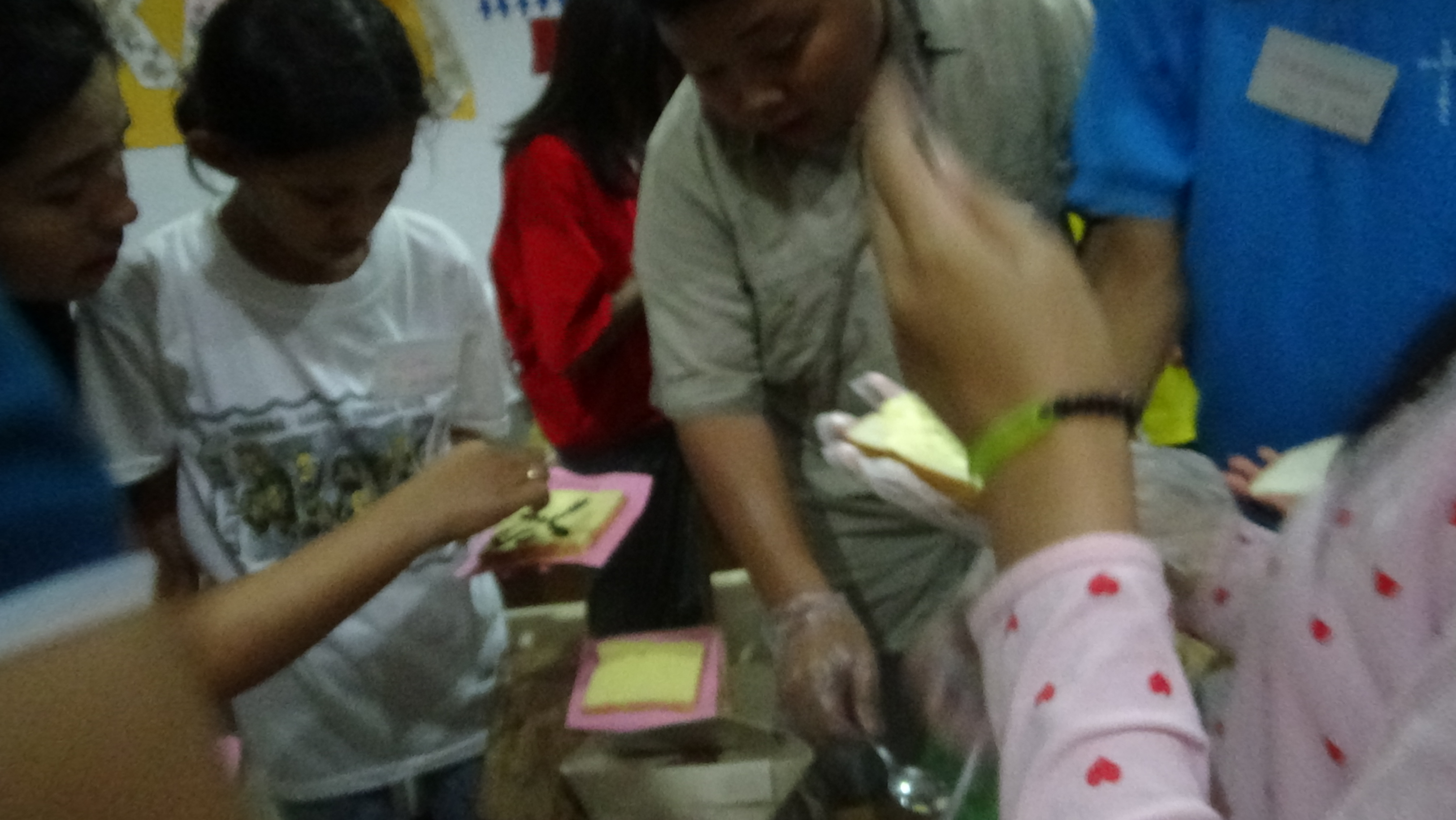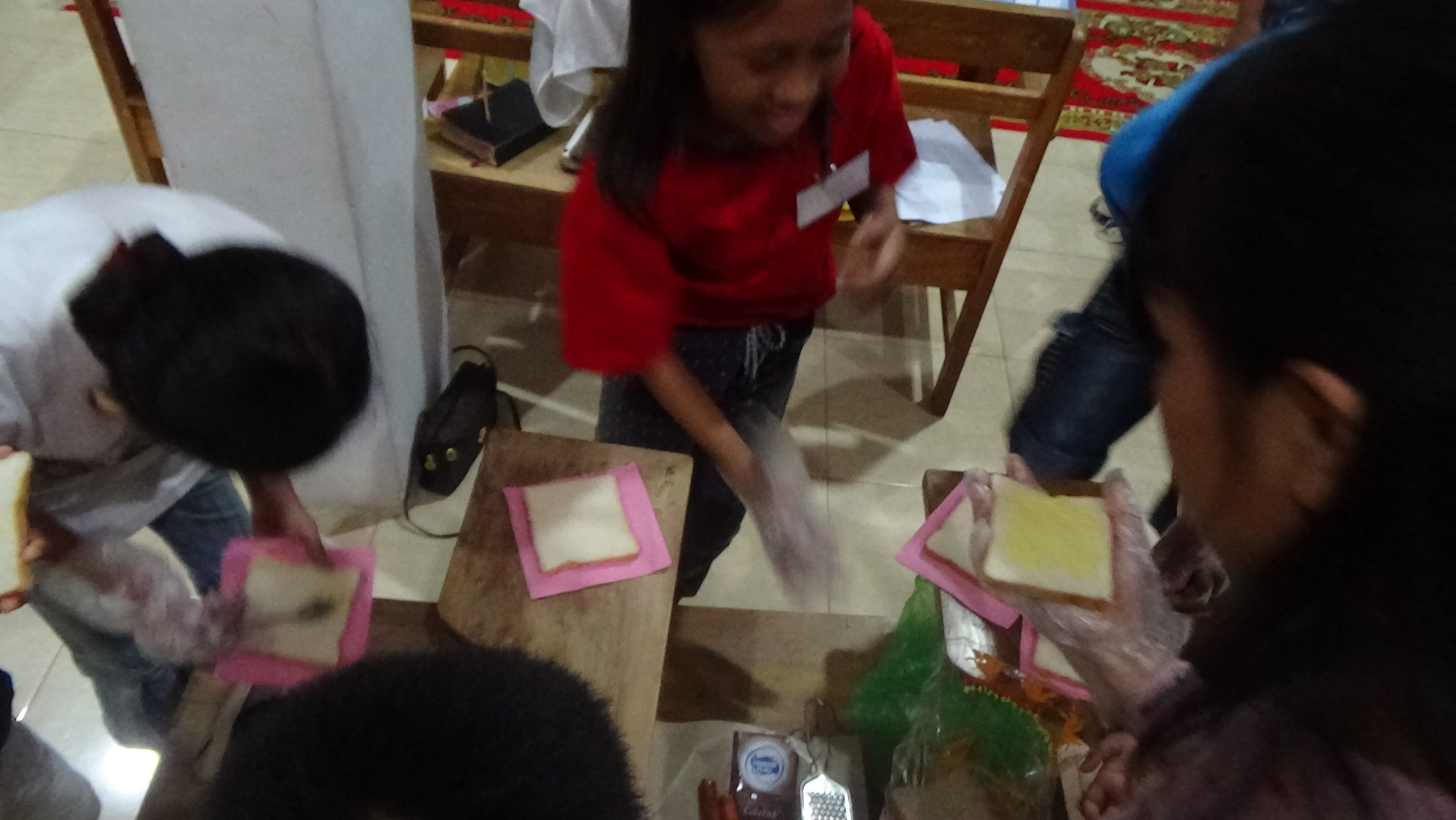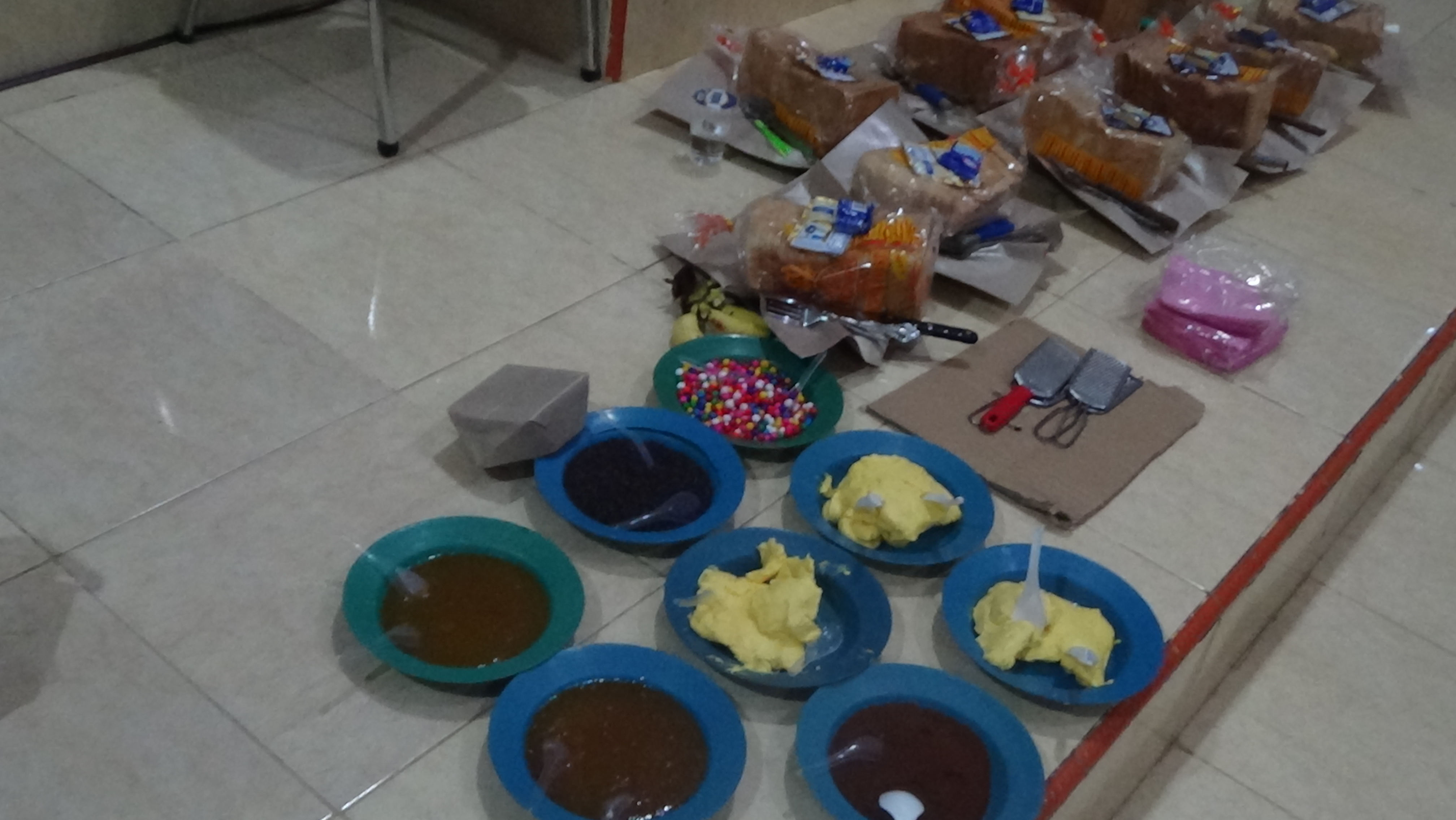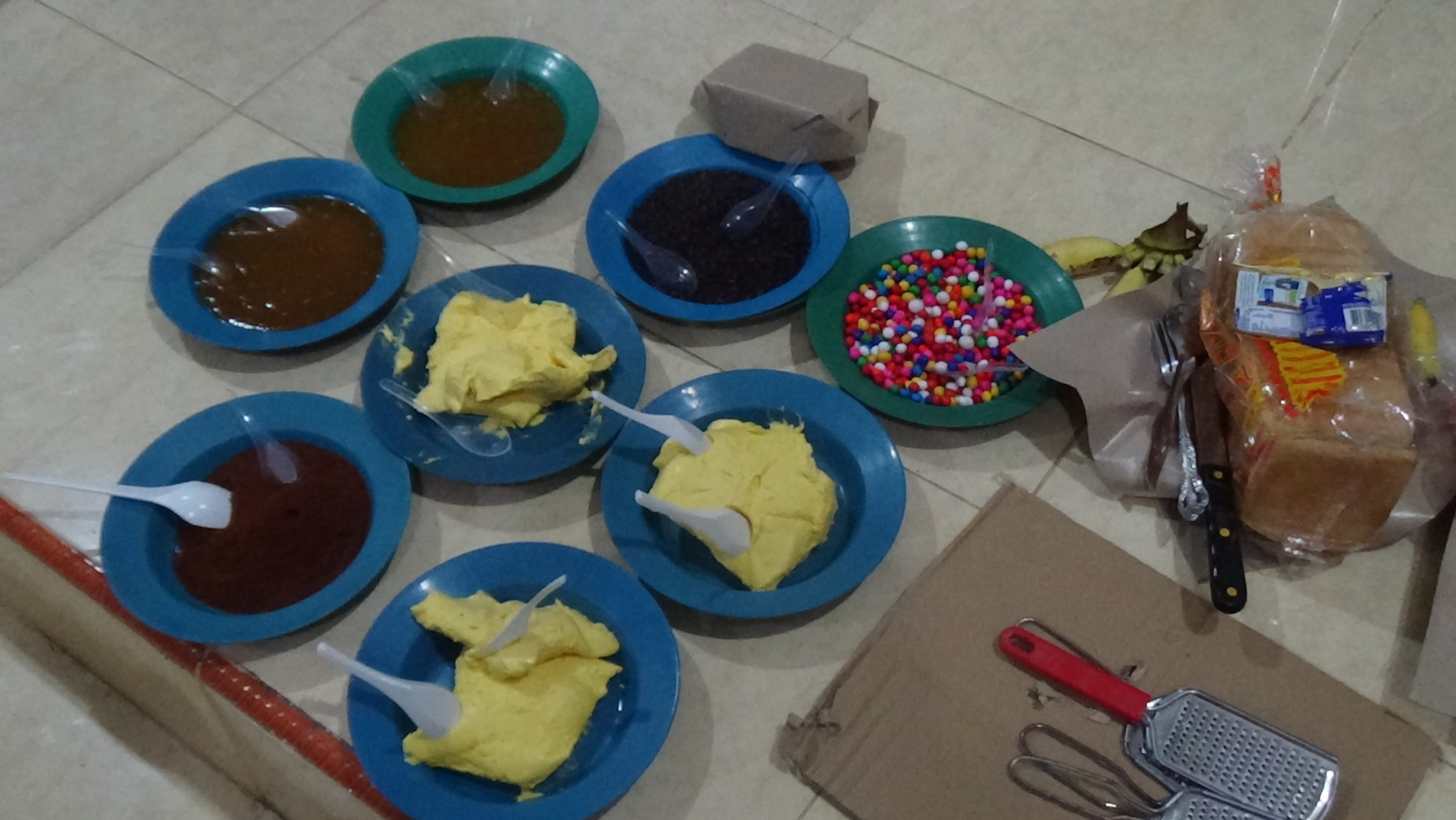 - Masing-masing kelompok mendapat 10 mangkok plastik, untuk mereka menaruh meises, dll ( biar mereka mengatur sendiri, agar mereka mandiri dalam membagi tugas dan peralatan serta bahan, jadi meises, keju, dll jangan dituangkan oleh panitia