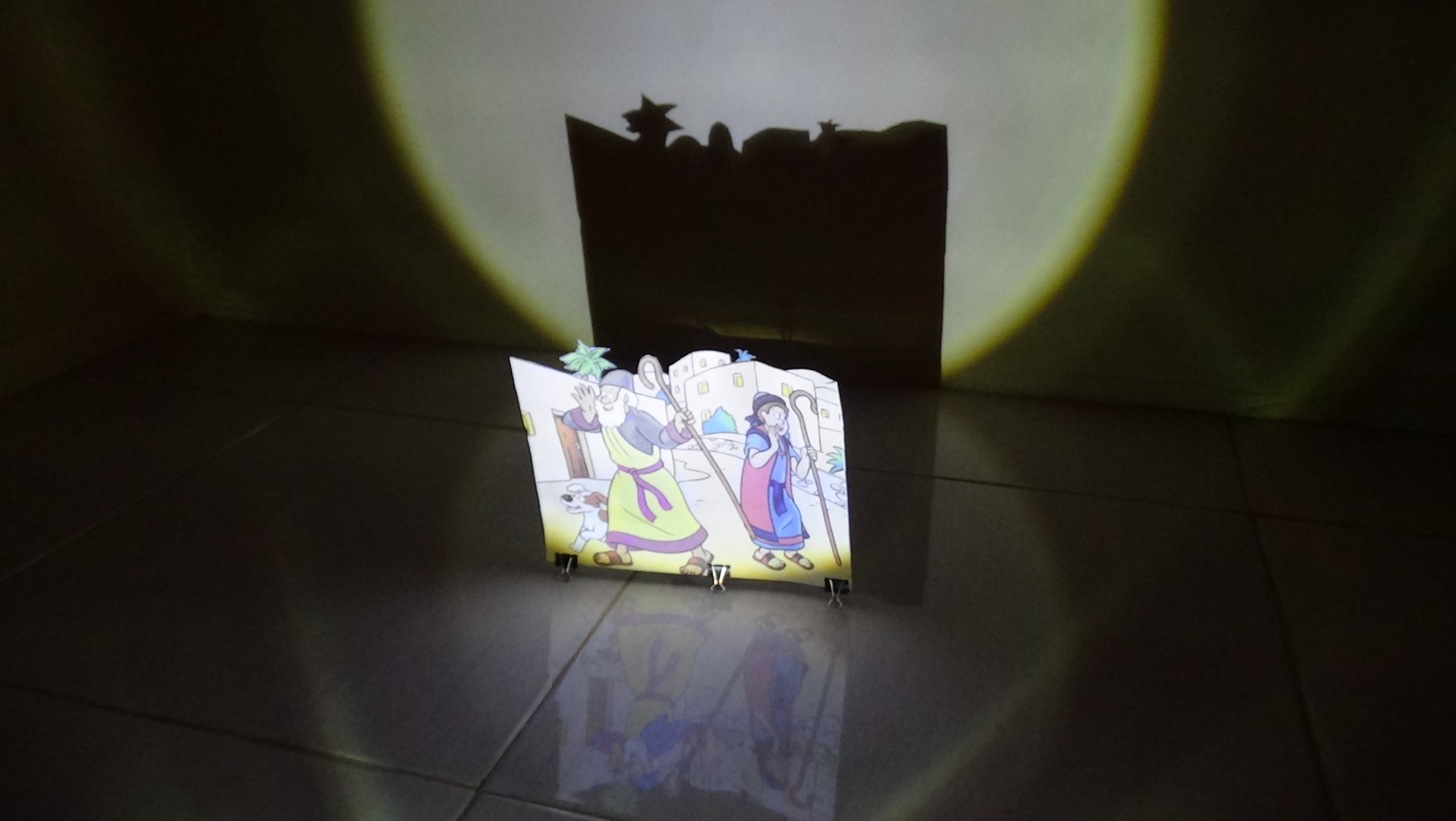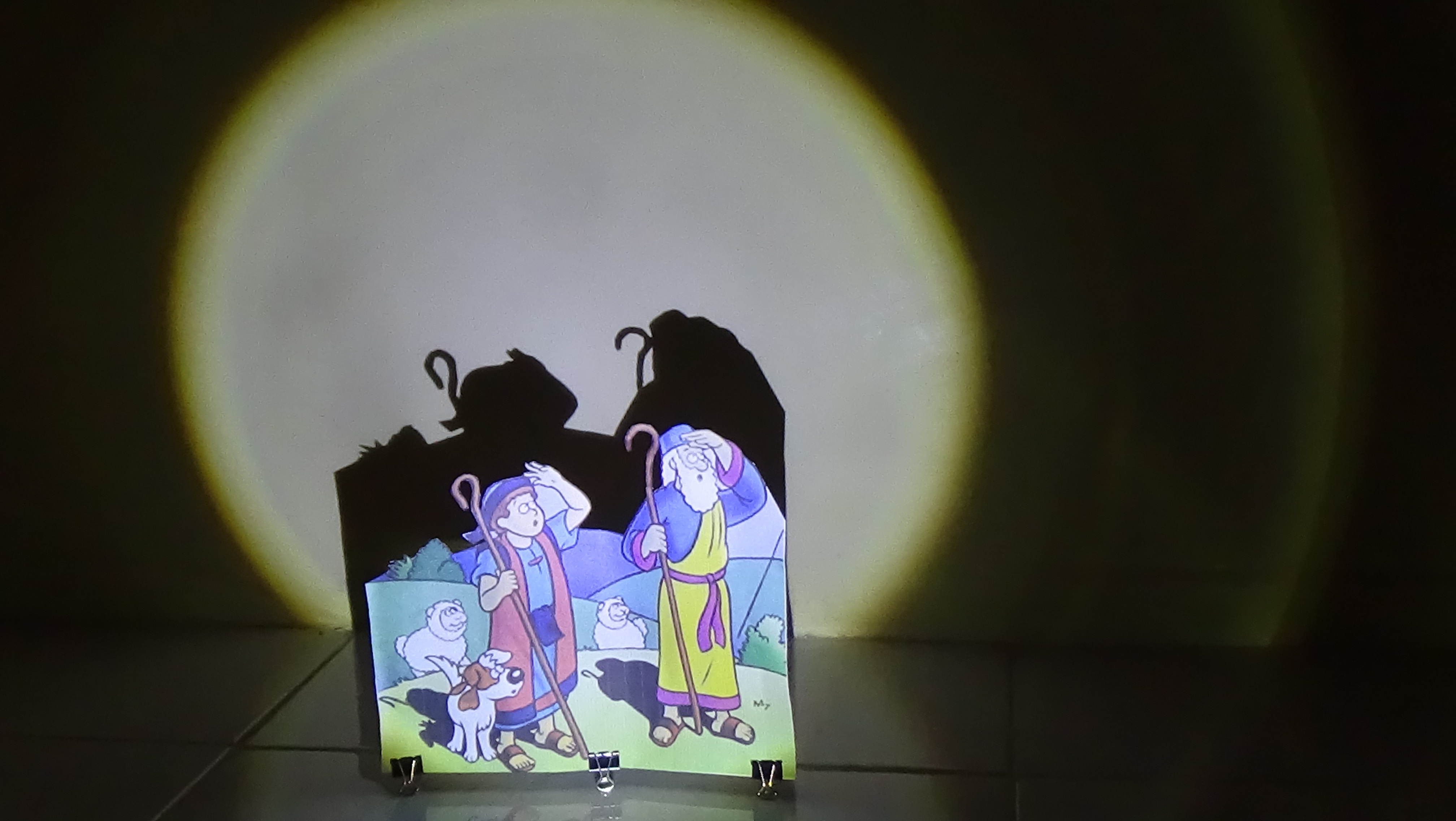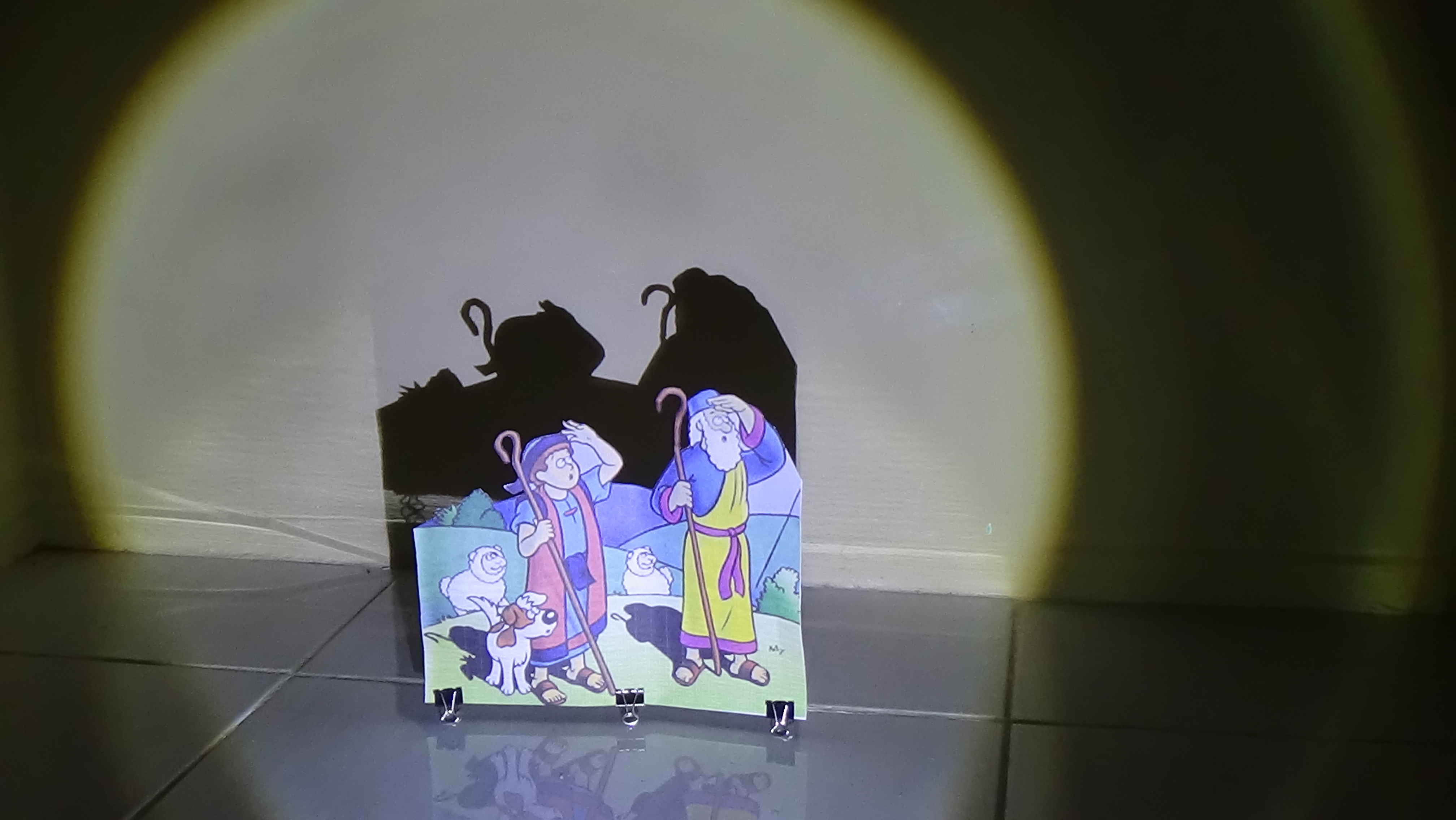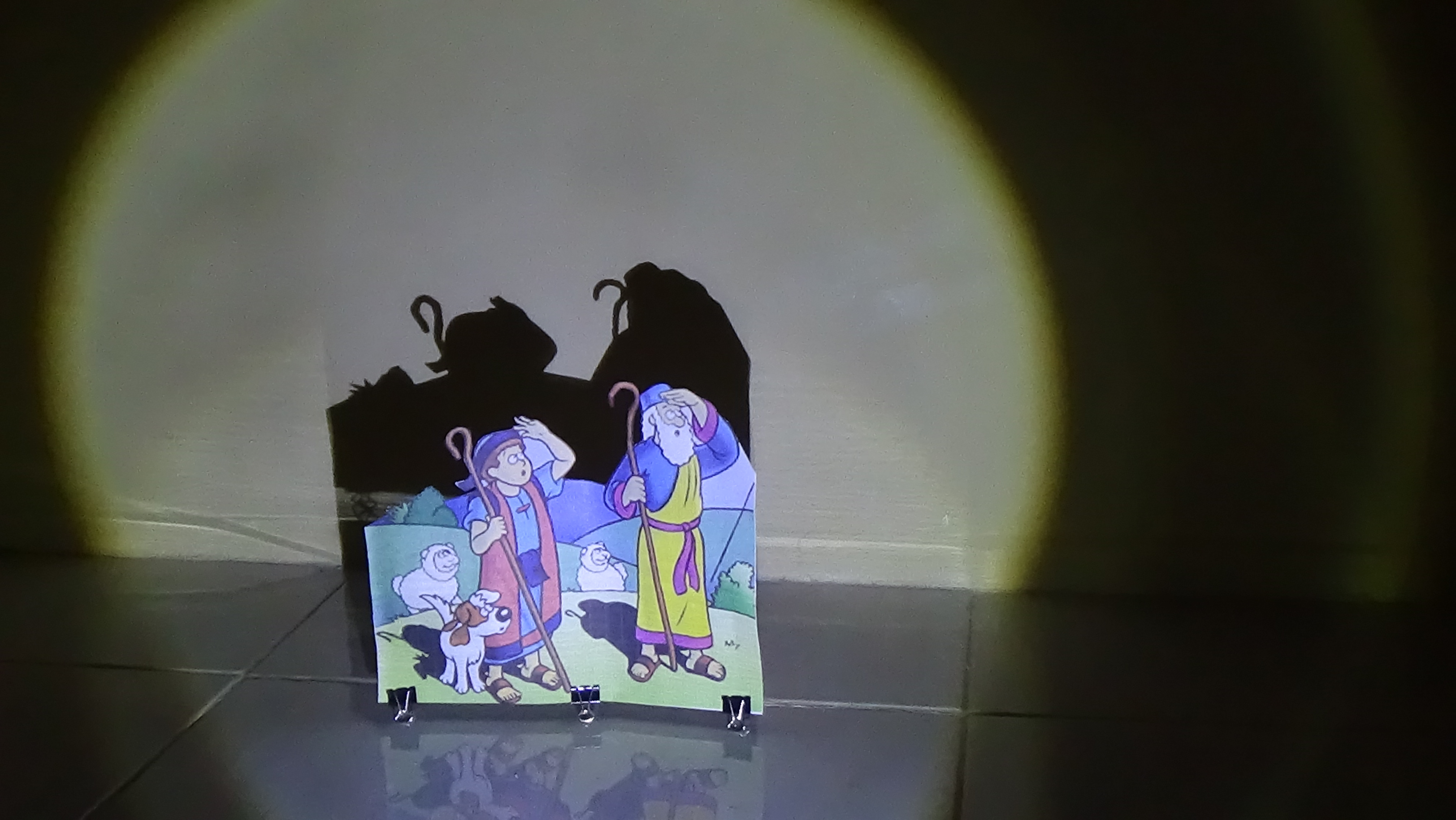 Tidak harus menggunakan gambar siluet untuk bercerita menggunakan lampu sorot, cukup gunakan gambar dari kertas tipis pun bisa, tahan dengan BINDER sehingga tidak catuh, ukuran binder pun bisa disesuaikan besar kecilnya gambar, dan gunakan senter khusus seperti pada contoh, yang dapat dibeli di toko alat bangunan atau di toko lampu.