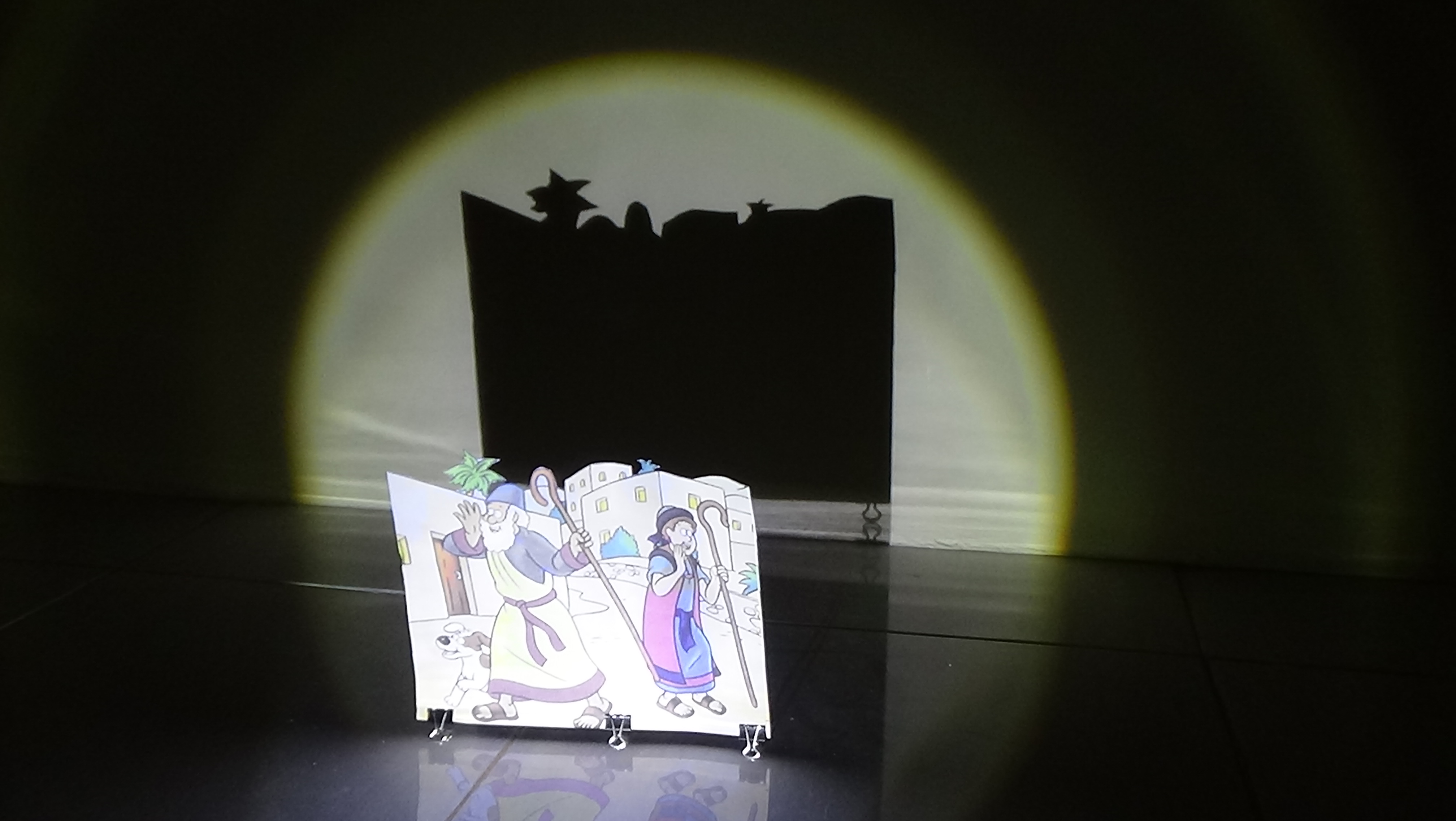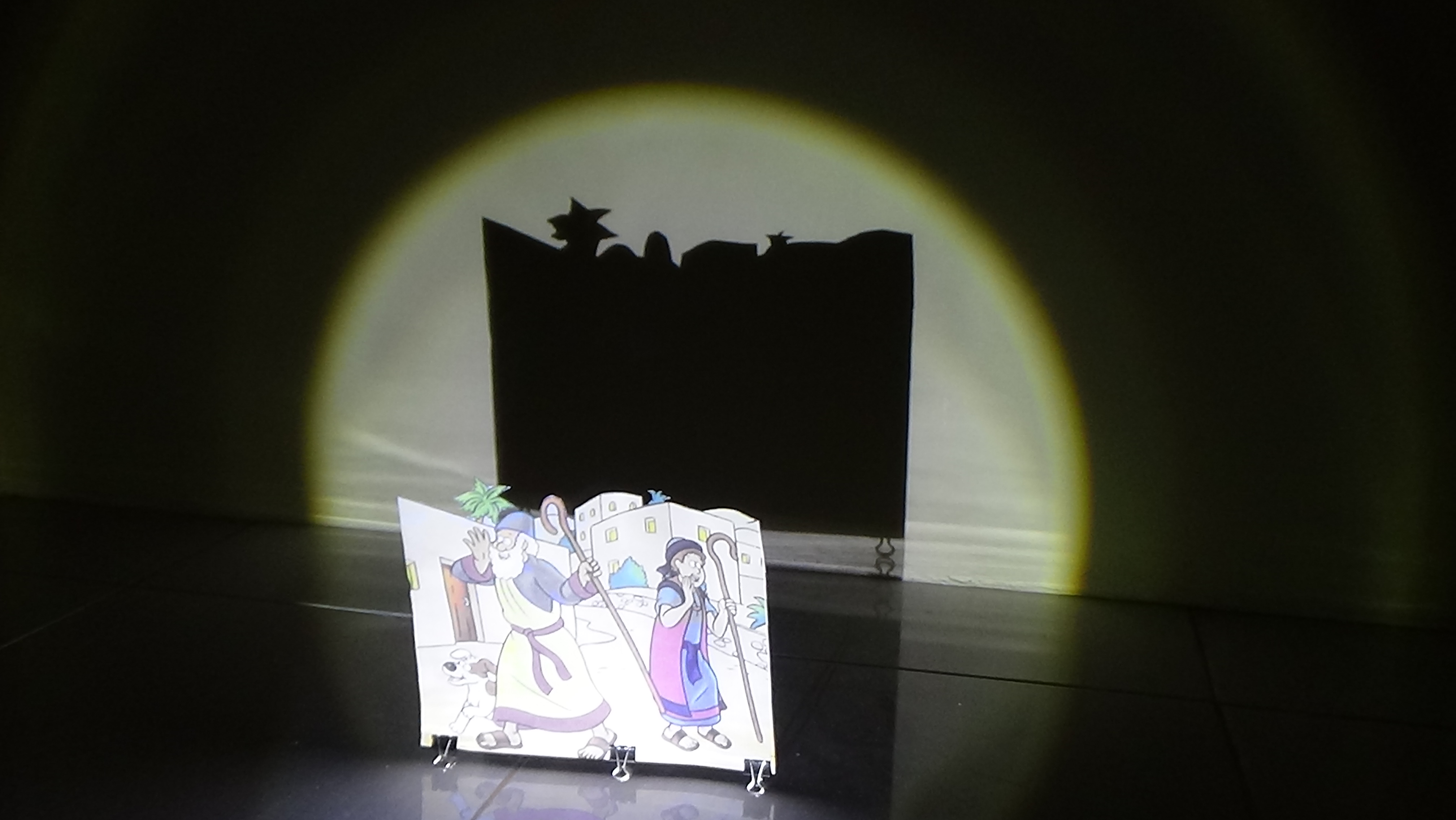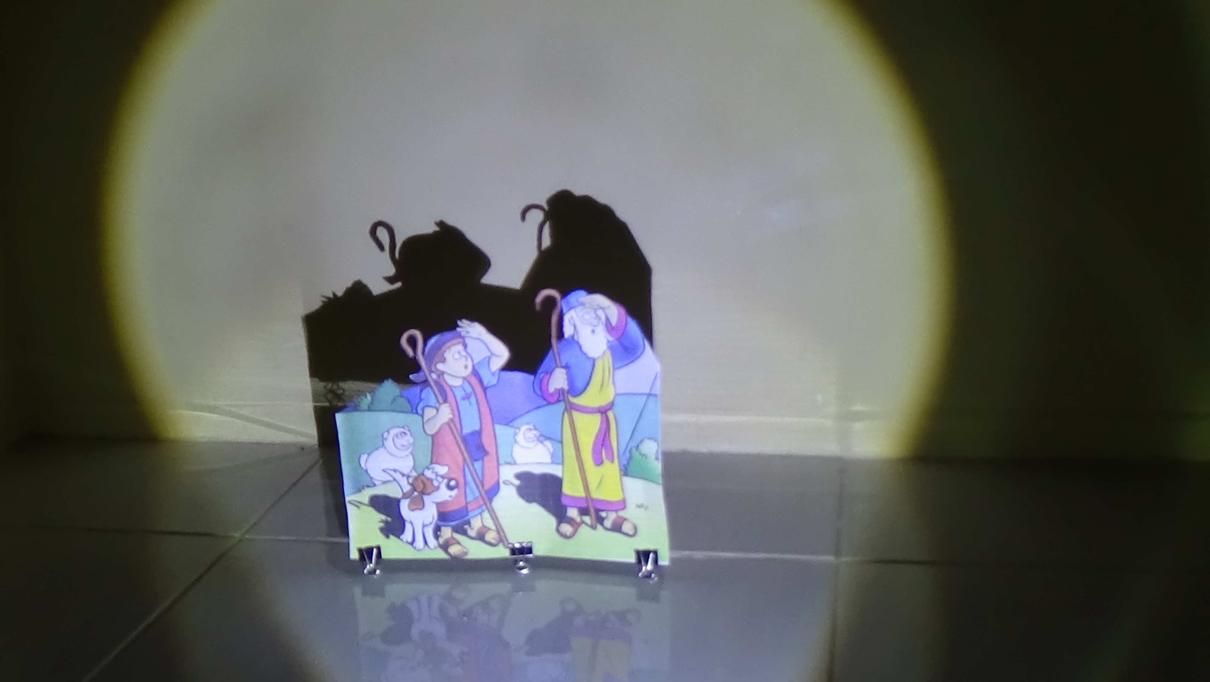Tidak harus menggunakan gambar siluet untuk bercerita menggunakan lampu sorot, cukup gunakan gambar dari kertas tipis pun bisa, tahan dengan BINDER sehingga tidak catuh, ukuran binder pun bisa disesuaikan besar kecilnya gambar, dan gunakan senter khusus seperti pada contoh, yang dapat dibeli di toko alat bangunan atau di toko lampu.