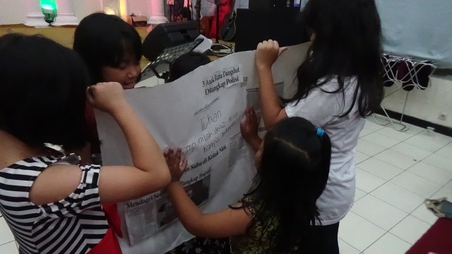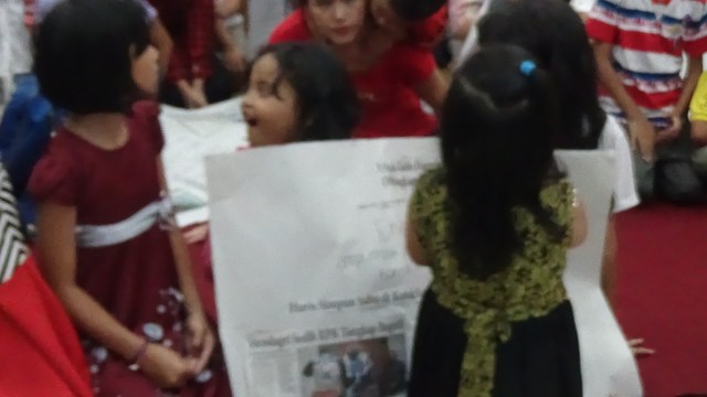 Bagikan koran terbaru pada anak-anak ( 1 koran lebih kurang untuk 5-7 anak) Jumlah koran akan mempengaruhi jumlah kelompok , dan minta mereka menyebutkan hal-hal apa yang saat ini terjadi di bangsa kita ( bisa hal negatif atau positif)