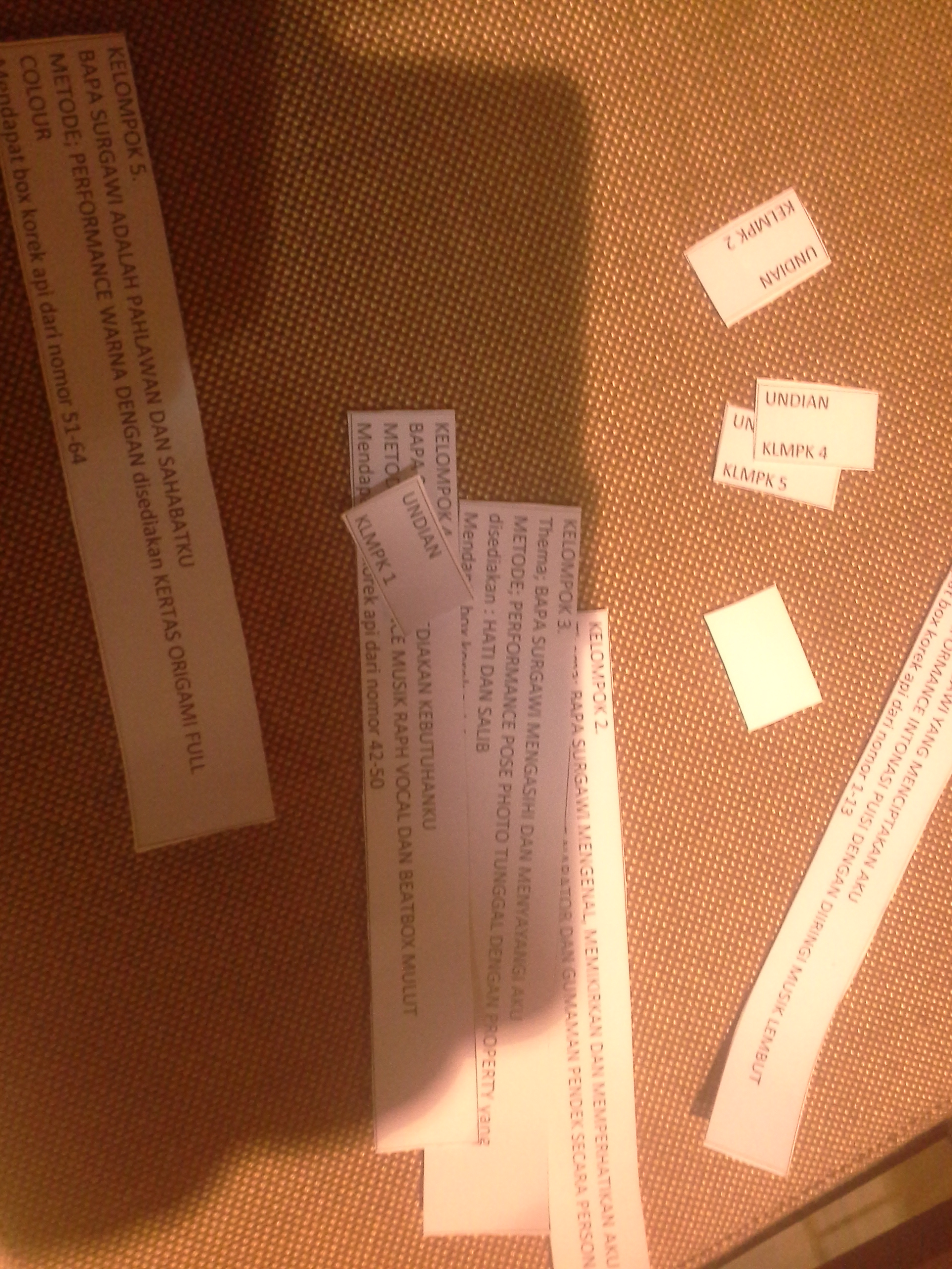 - Pembicara akan menunjuk salah satu anak / siapa yang berani memilih dari barang-barang yang dipajang (- sama dengan yang dipersiapkan di termin 2) , yang dapat mengingatkan kamu tentang ayahmu di bumi, untuk menceritakan BAGAIMANA AYAHMU SEBAGAI PAHLAWAN DAN SAHABAT BUATMU