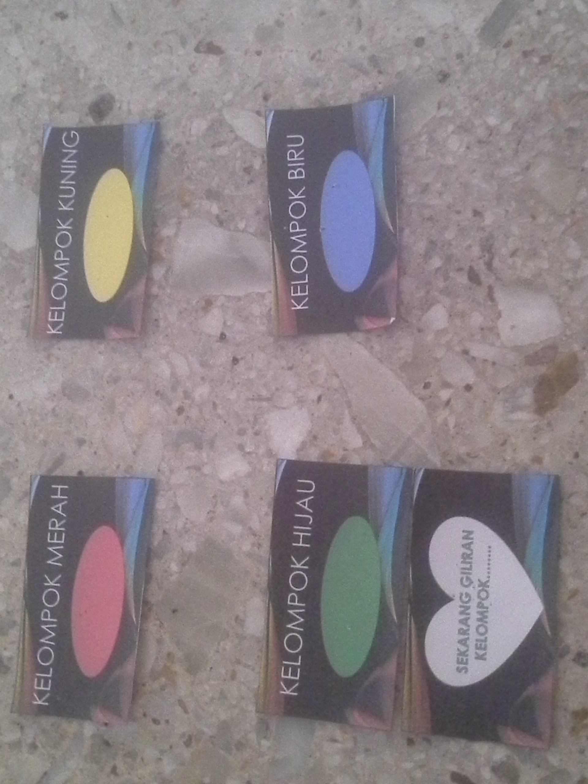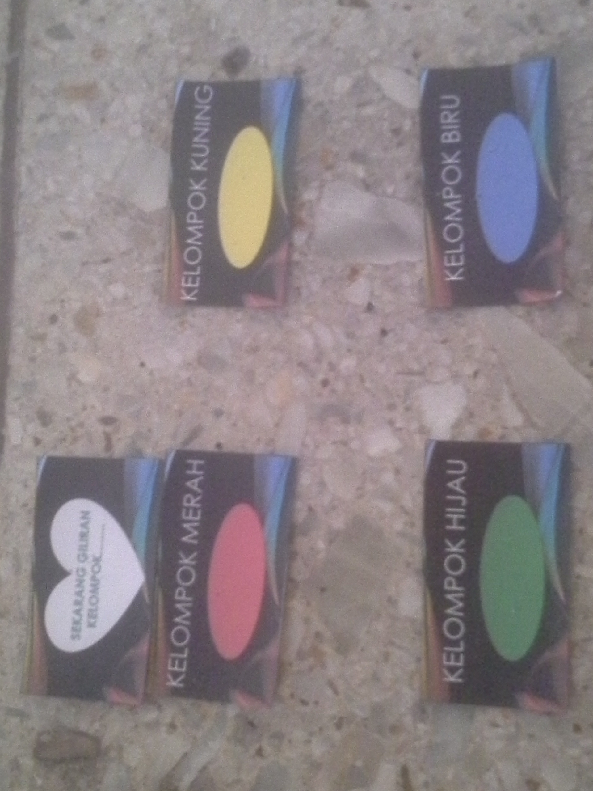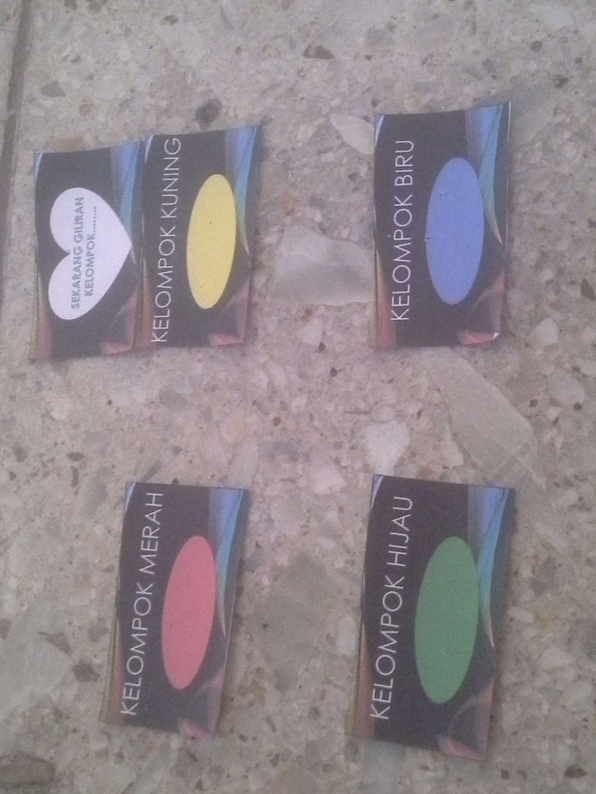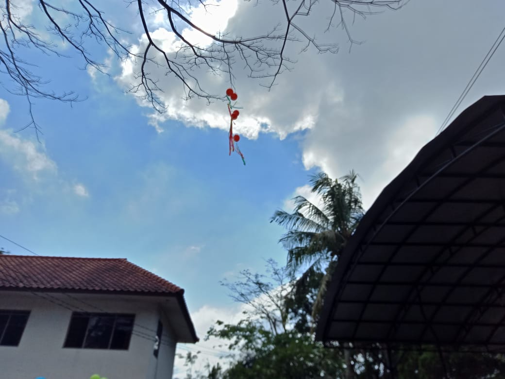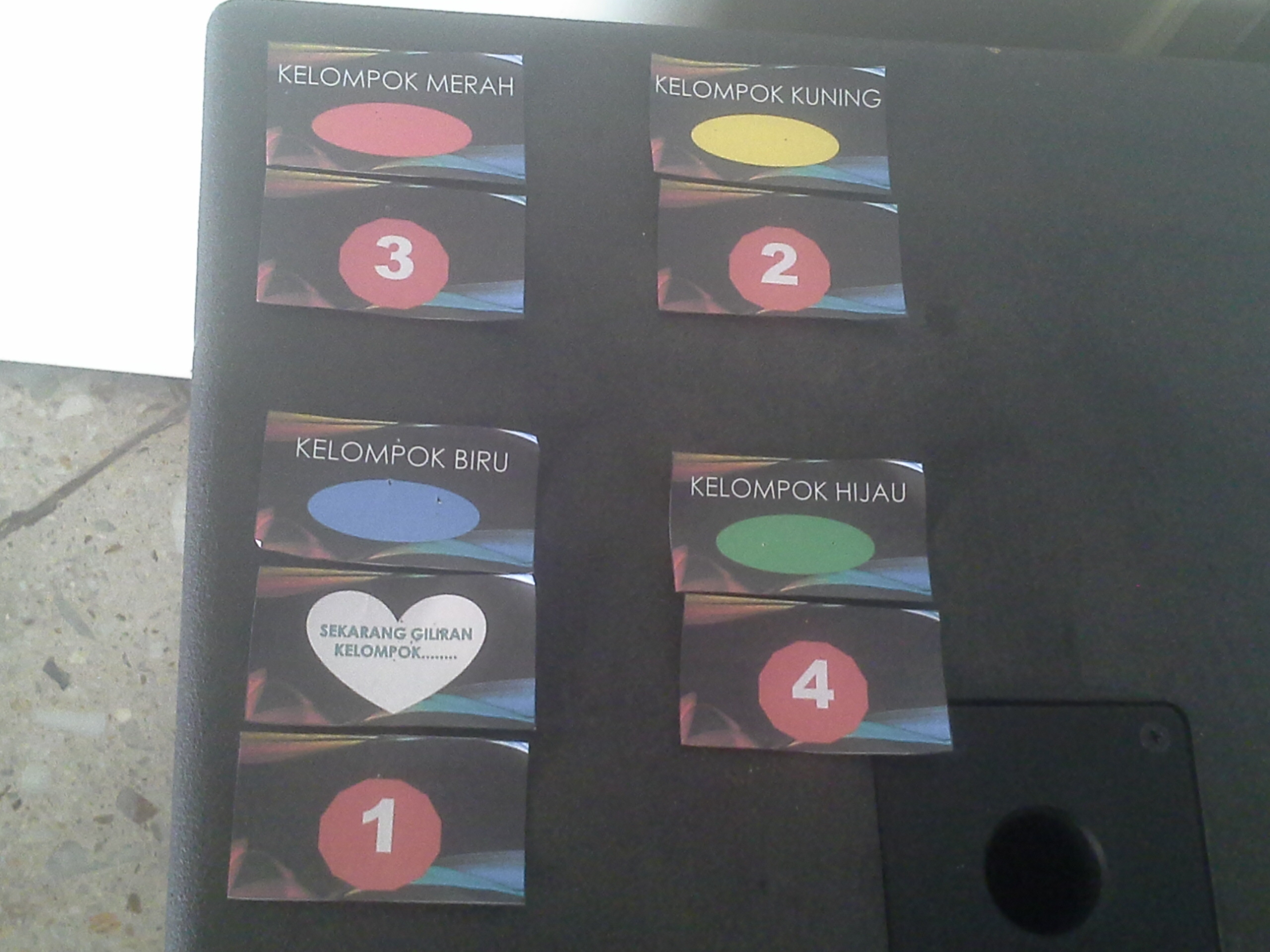 - BALON GAS AKAN DIPAJANG DENGAN PEMBERATNYA MASING-MASING DI DEPAN DUDUKNYA PARA KELOMPOK SESUAI WARNANYA. BALON MERAH DI AREA DEPAN KELOMPOK MERAH, DST