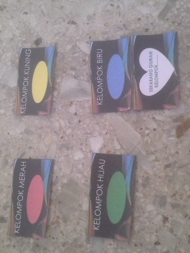 - Kita akan bagi anak anak dalam 4 kelompok. Usahakan pembagian kelompok ini dilakukan sebelum sesi, sehingga tidak memakan waktu banyak pada jam durasi sesi.
