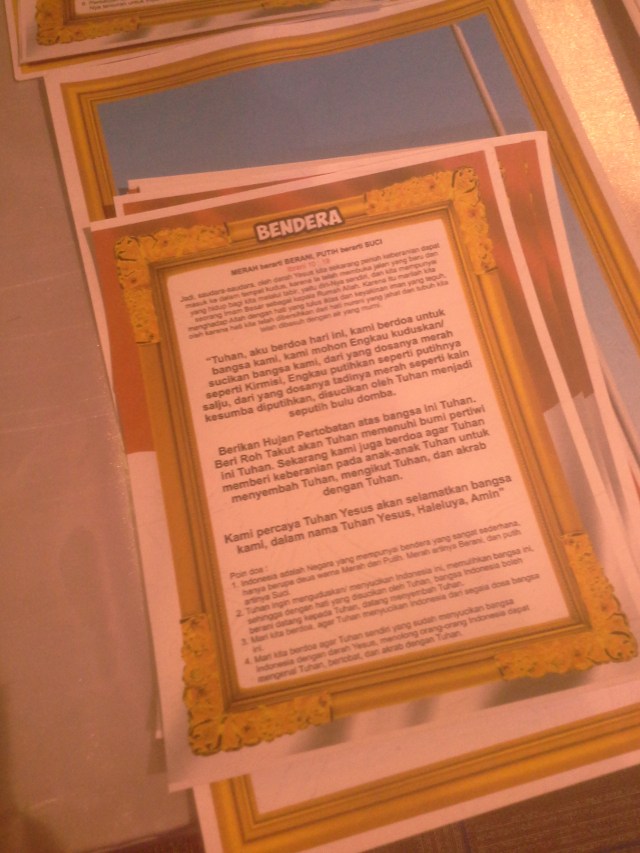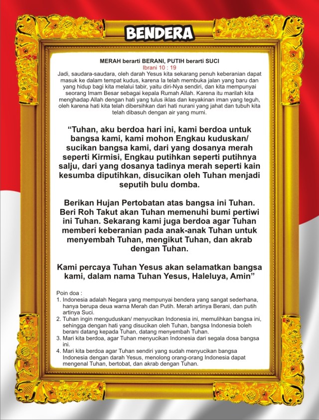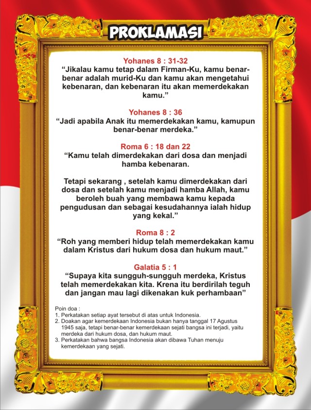 - Doakan agar kemerdekaan Indonesia bukan hanya tanggal 17 Agustus 1945 saja, tetapi benar-benar kemerdekaan sejati bangsa ini terjadi, yaitu merdeka dari hukum dosa, dan hukum maut