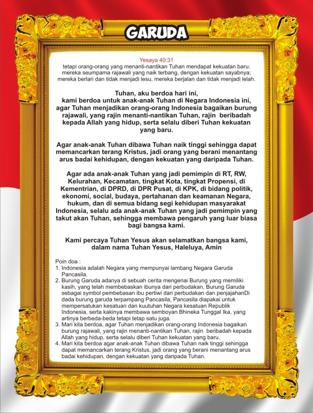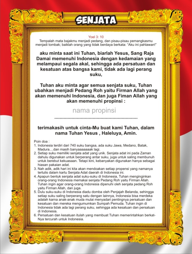 - Aku minta Engkau bangkit sebagai Pahlawan yang berperang atas Indonesia, sehingga semua musuh-musuhMu Indonesia bisa dikalahkan.