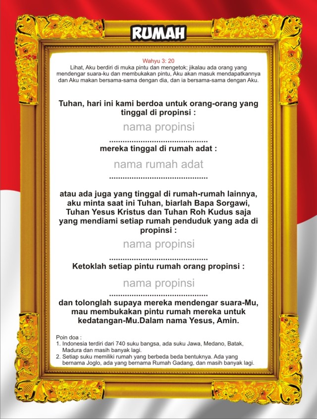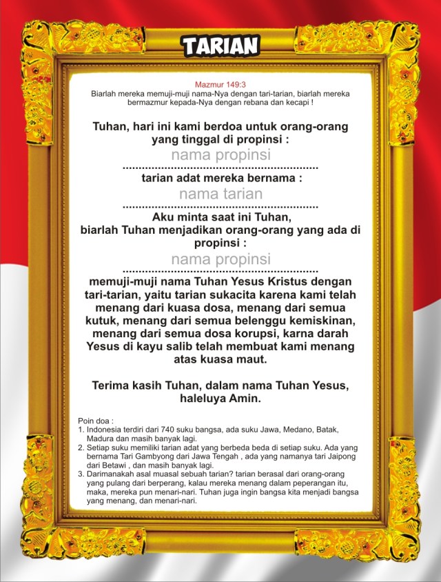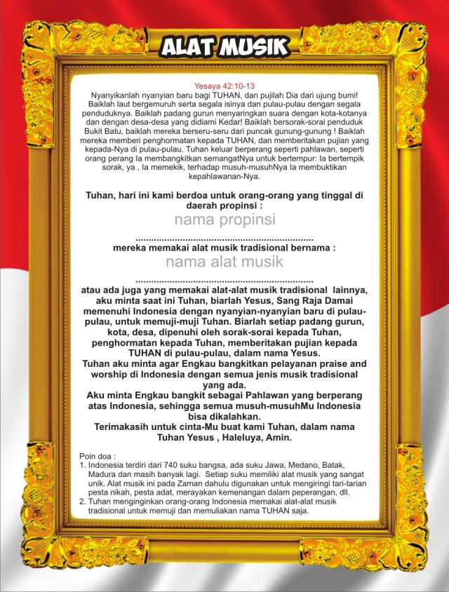 - Tuhan, hari ini kami berdoa untuk orang-orang yang tinggal di daerah. …………………………. mereka memakai alat musik tradisional bernama …………………………. atau ada juga yang memakai alat-alat musik tradisional lainnya, aku minta saat ini Tuhan, biarlah Yesus, Sang Raja Damai memenuhi Indonesia dengan nyanyian-nyanyian baru di pulau-pulau, untuk memuji-muji Tuhan. Biarlah setiap padang gurun, kota, desa, dipenuhi oleh sorak-sorai kepada Tuhan, penghormatan kepada Tuhan, memberitakan pujian kepada TUHAN di pulau-pulau, dalam nama Yesus.