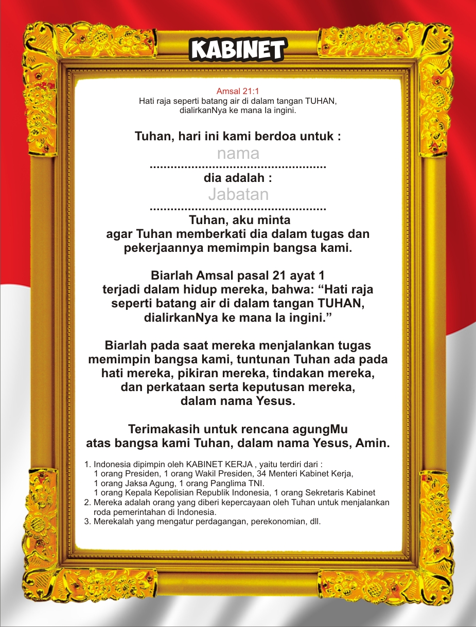 - Doakan agar kemerdekaan Indonesia bukan hanya tanggal 17 Agustus 1945 saja, tetapi benar-benar kemerdekaan sejati bangsa ini terjadi, yaitu merdeka dari hukum dosa, dan hukum maut
