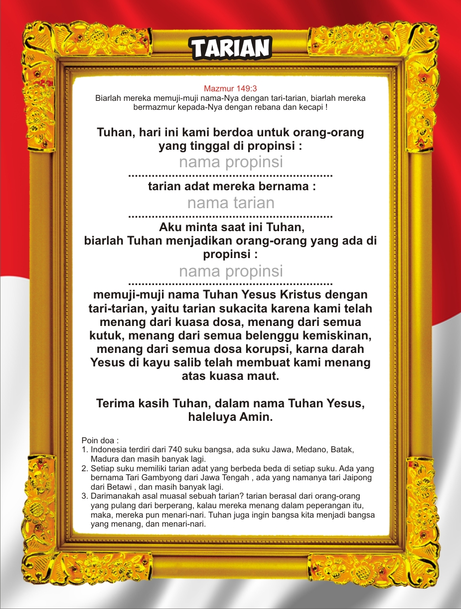 - Tuhan, hari ini kami berdoa untuk orang-orang yang tinggal di daerah. …………………………. mereka memakai alat musik tradisional bernama …………………………. atau ada juga yang memakai alat-alat musik tradisional lainnya, aku minta saat ini Tuhan, biarlah Yesus, Sang Raja Damai memenuhi Indonesia dengan nyanyian-nyanyian baru di pulau-pulau, untuk memuji-muji Tuhan. Biarlah setiap padang gurun, kota, desa, dipenuhi oleh sorak-sorai kepada Tuhan, penghormatan kepada Tuhan, memberitakan pujian kepada TUHAN di pulau-pulau, dalam nama Yesus.
