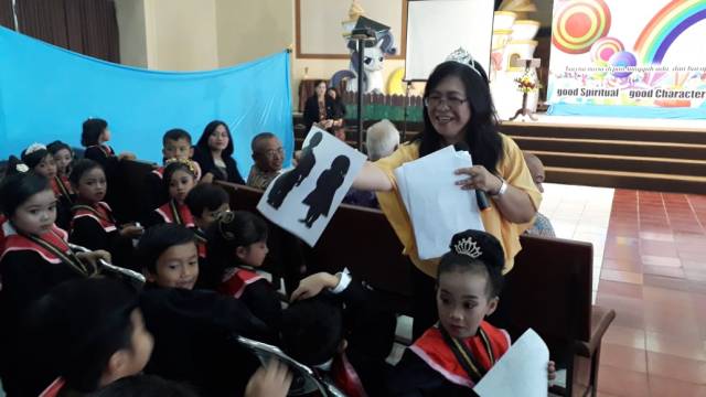 - Bila anda memakai 2 gambar yang sama, maka gambar lain bisa dibantu sorot oleh anak-anak dan gambar bisa dibantu pegang oleh anak-anak juga/ ini adalah cara untuk melibatkan mereka dan suatu solusi bila ruangan cukup besar, sehingga tidak cukup hanya satu gambar di satu titik panggung, melainkan bisa menggunakan 2 gambar atau lebih di beberapa titik panggung. Untuk itu siapkan beberapa senter sesuai kebutuhan anda.