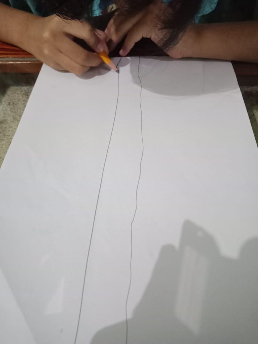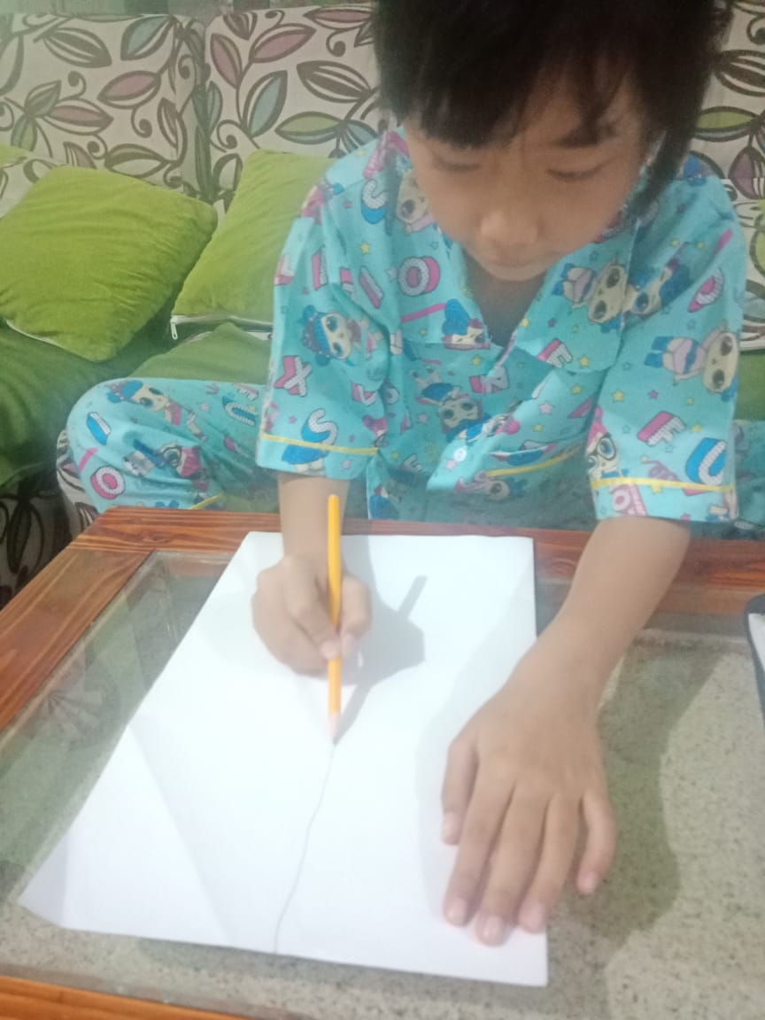 - Letakkan selembar HVS dengan mendatar/ horisontal, lalu goreskan dengan pensil atau ballpoint atau sepidol kecil, sebuah garis lurus dari ujung kertas HVS kepada ujung lainnya. Tidak boleh pakai penggaris lho ya. Usahakan selurus mungkin. Lalu cek dengan penggaris, apakah hasilnya bisa lurus sekali? Boleh mencoba beberapa kali. Ah sulit sekali ternyata membuat garis lurus kalau tidak dibantu dengan penggaris ya??!!