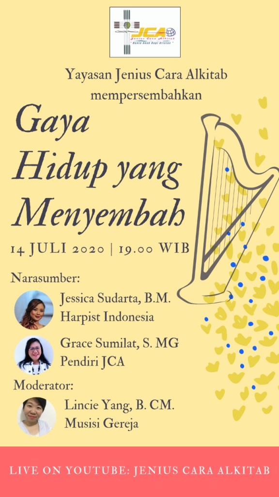 Gaya Hidup yang menyembah adalah sebuah topik bincang-bincang bersama Harpist Indonesia, Jessica Sudarta, BM dan dipandu oleh Moderator; Lincie Yang, B.CM, bersama Pendiri JCA, Grace Sumilat, S.MG.
