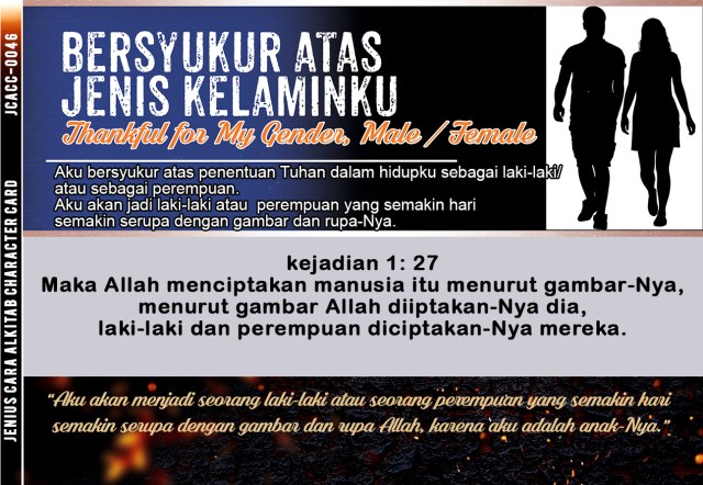 Tuhan, aku mau bersyukur karena diciptakan sebagai laki-laki atau perempuan, aku tahu bahwa Engkau mempunyai rencana yang indah dalam hidupku, dan Engkau tidak pernah salah menciptakan aku seperti ini, di dalam nama Yesus, aku mau jadi laki laki sejati, dan perempuan sejati, di dalam nama Yesus, amin.