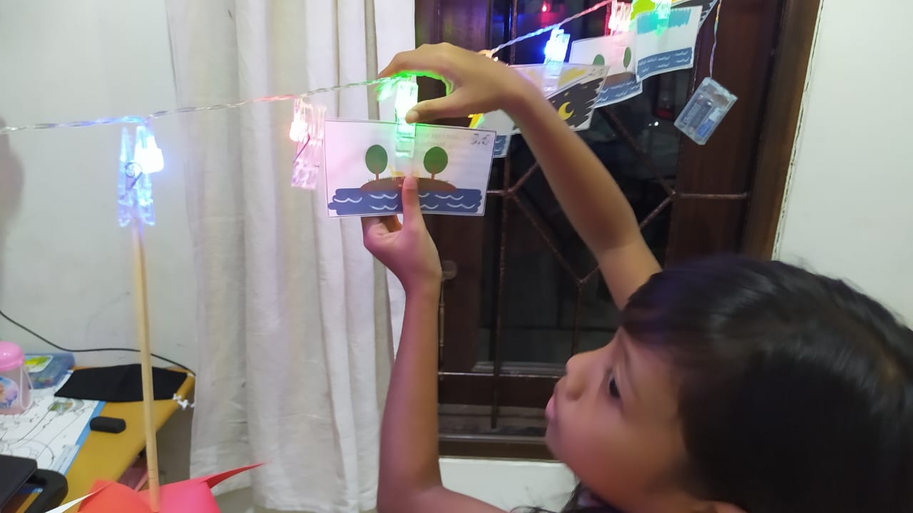 - Si penyusun ketika menyusun jemuran, harus berteriak keras-keras menyebutkan kartu-kartu yang disusunnya, agar ayah/bunda yang sedang bersembunyi dapat tahu, sekarang sudah sampai pada gambar hari ke berapa.
