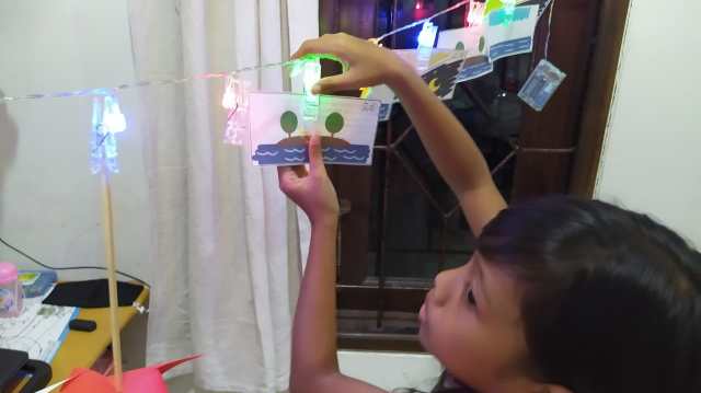 - Gunakan design gambar yang telah tersedia/ print di kertas tebal dan gunting, jepitkan pada tali rafia yang telah dibuat seperti jemuran di dalam ruangan. Atur tinggi jemuran setinggi yang dapat dijangkau anak-anak. Jepitan jemuran bisa diganti sistem lain yang mudah untuk anak-anak memainkannya.