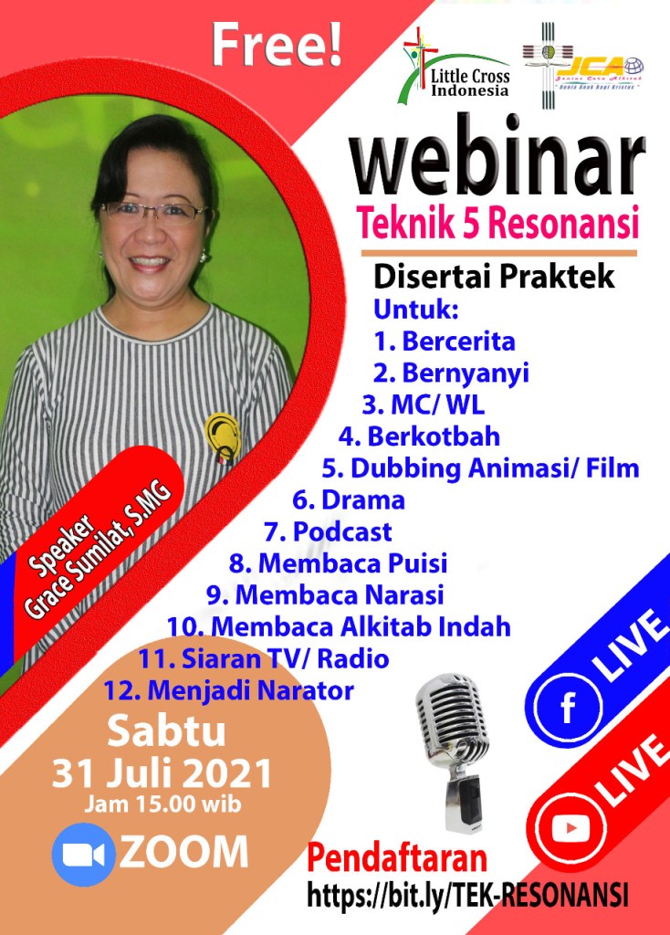 Kami dari Little Cross Indonesia bekerjasama dengan Jenius Cara Alkitab ( JCA) mengundang Bapak/ Ibu/ Sdr/i yang terkasih dalam Tuhan Yesus untuk menghadiri acara WEBINAR TEKNIK 5 RESONANSI yaitu bagaimana menjadikan suara kita menjadi merdu dan enak di dengar.