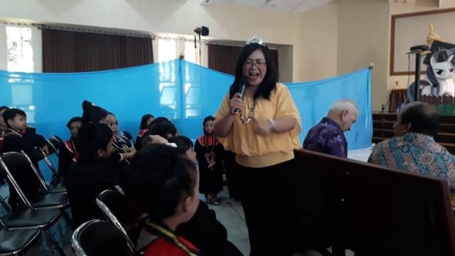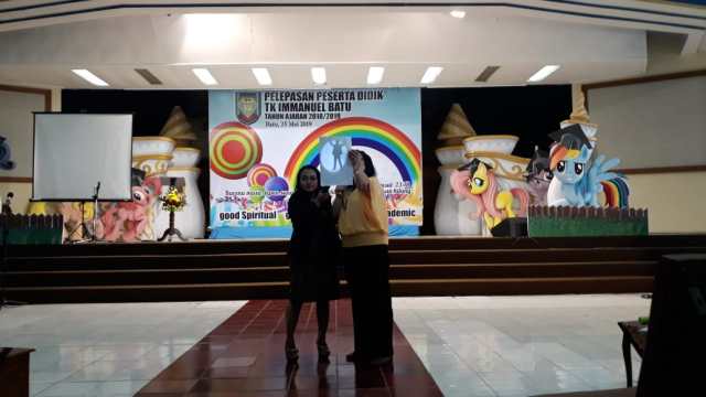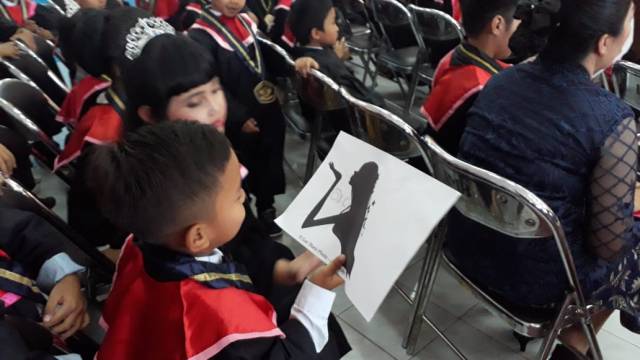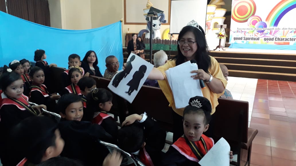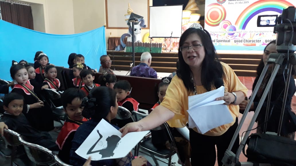 - Bila anda memakai 2 gambar yang sama, maka gambar lain bisa dibantu sorot oleh anak-anak dan gambar bisa dibantu pegang oleh anak-anak juga/ ini adalah cara untuk melibatkan mereka dan suatu solusi bila ruangan cukup besar, sehingga tidak cukup hanya satu gambar di satu titik panggung, melainkan bisa menggunakan 2 gambar atau lebih di beberapa titik panggung. Untuk itu siapkan beberapa senter sesuai kebutuhan anda.