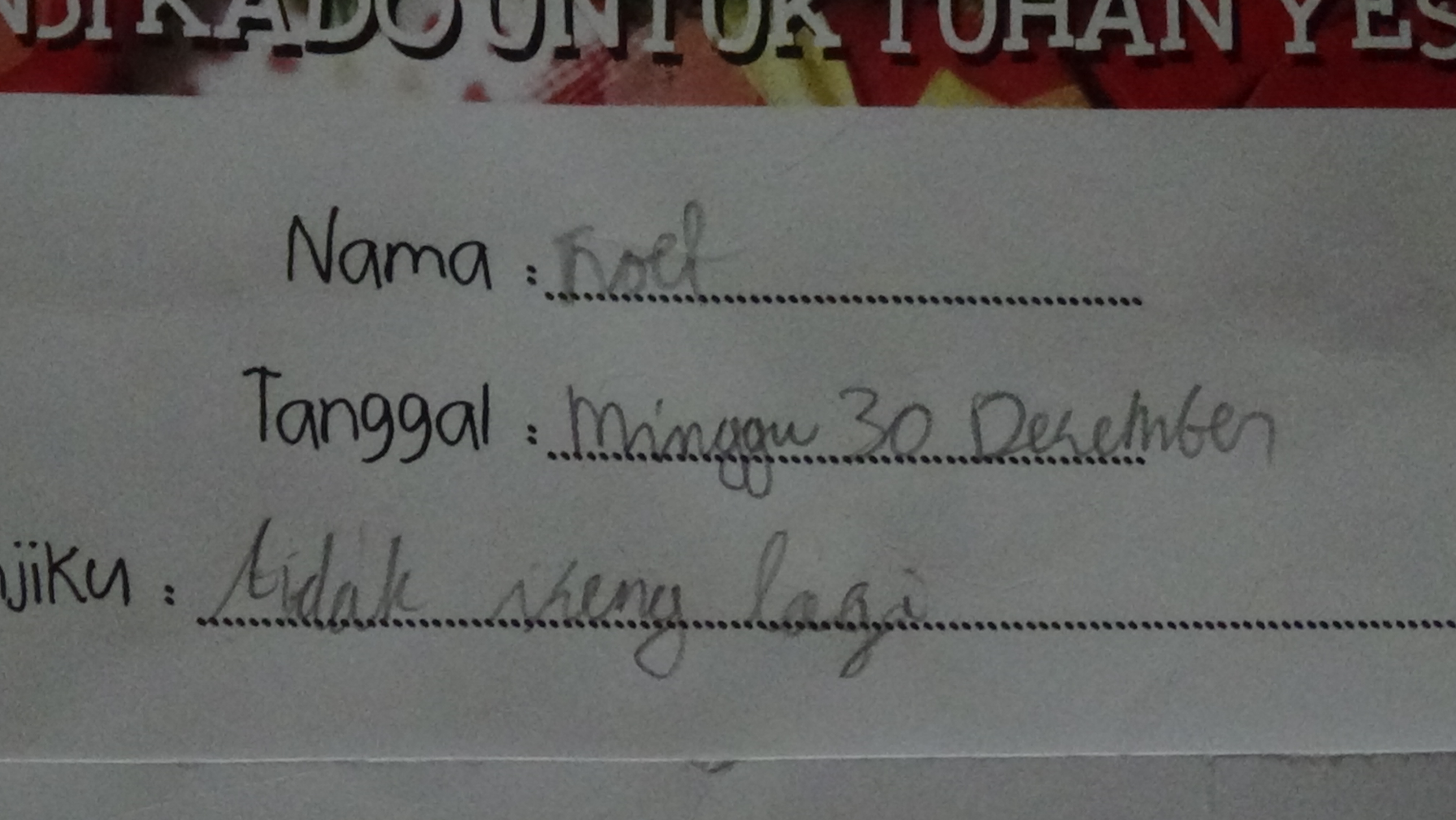 Ingatlah adik-adik, bahwa rajin melakukan kegiatan keagamaan saja belum cukup untuk menyenangkan hati Tuhan. Misalnya rajin ke gereja, rajin memberikan persembahan di gereja, rajin pelayanan, rajin mengikuti acara –acara di gereja, rajin membawa Alkitab ke mana pun, misalnya; karena biar disebut orang Kristen, karena biar punya agama, karena biar nggak diomelin papa dan mama, karena lahir di keluarga Kristen, karena sudah kebiasaan kalau hari Minggu itu harus ke gereja, karena sebagai anak pendeta, karena sebagai anak majelis, karena papa dan mama guru sekolah minggu, karena harus mengumpulkan nilai untuk pelajaran agama di sekolah, karena takut masuk neraka.