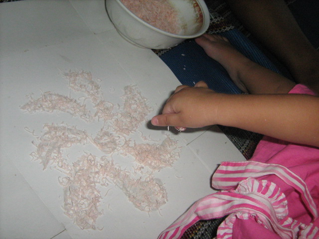 BUAT GAMBAR BUNGA DENGAN JARI BERLUMURAN LEM, TAPI CONTOH GAMBAR INI KURANG BAIK, KARNA JARAK KELOPAK BUNGA TERLALU DEKAT SEHINGGA HASIL BUNGA TABURAN SABUN, KURANG JELAS HASILNYA.