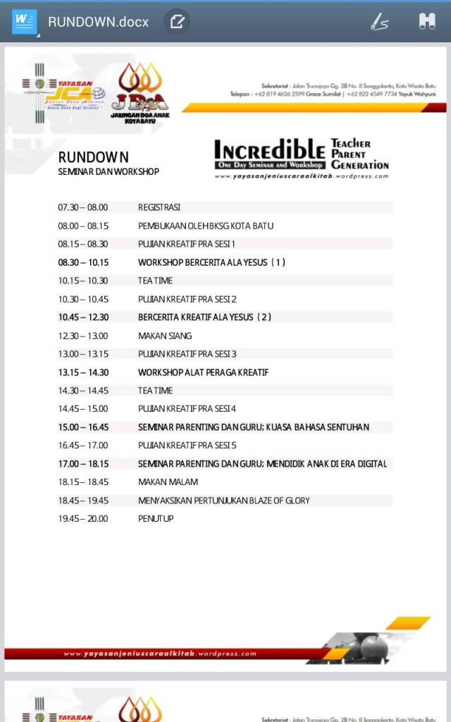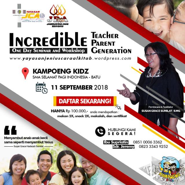 Puji Tuhan, Yayasan JCA ( Jenius Cara Alkitab) dan JDA ( Jaingan Doa Anak) Kota Wisata Batu, dengan diketahui oleh BKSG Kota Wisata Batu, akan menggelar Seminar untuk Guru Sekolah Minggu, Guru Agama, Orang Tua , di SMA Selamat Pagi Indonesia.