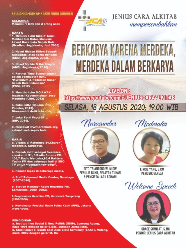 Saksikan malam ini di Kanal YouTube Jenius Cara Alkitab, Selasa, 18 Agustus 2020, jam 19.00 WIB, atau jam 20.00 WITA atau jam 21.00 WIT